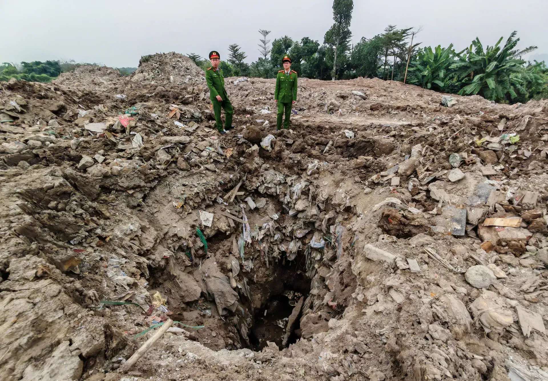 Theo cơ quan công an, qua công tác nắm tình hình địa bàn và triển khai các biện pháp trinh sát, lực lượng chức năng đã phát hiện dấu hiệu đổ, lấp trái phép chất thải rắn thông thường (trạc thải xây dựng) tại khu đất nông nghiệp nằm cạnh nhà vườn Bảo Vy Garden, đường Lý Thánh Tông, xã Bát Tràng, TP Hà Nội. Khu đất này không được che chắn, thu gom, xử lý theo đúng quy định về bảo vệ môi trường.