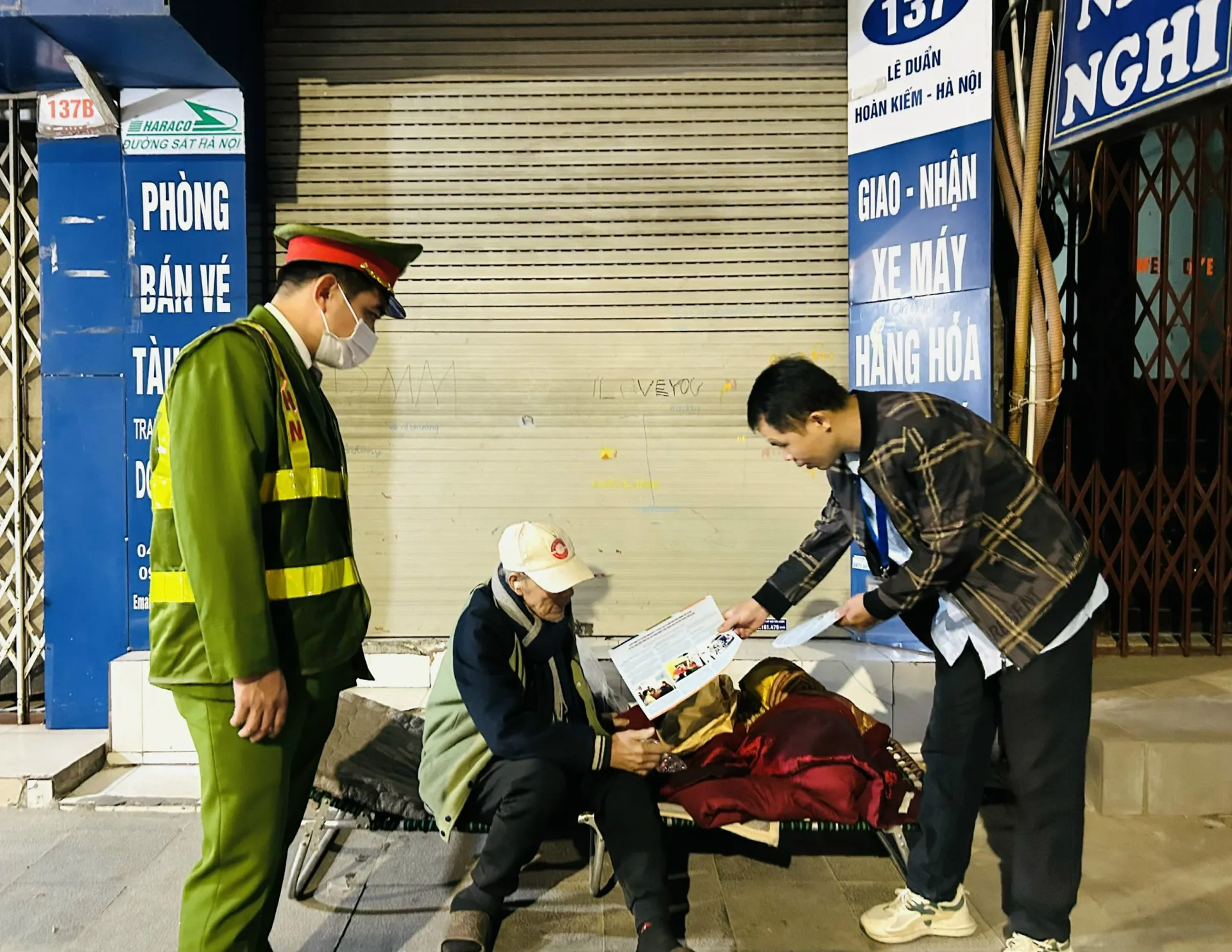 Công an Phường Cửa Nam và Đội Trật tự xã hội lưu động tuyên truyền Quyết định 2252/QĐ-UBND tới người lang thang. Ảnh: Thủy Trúc.