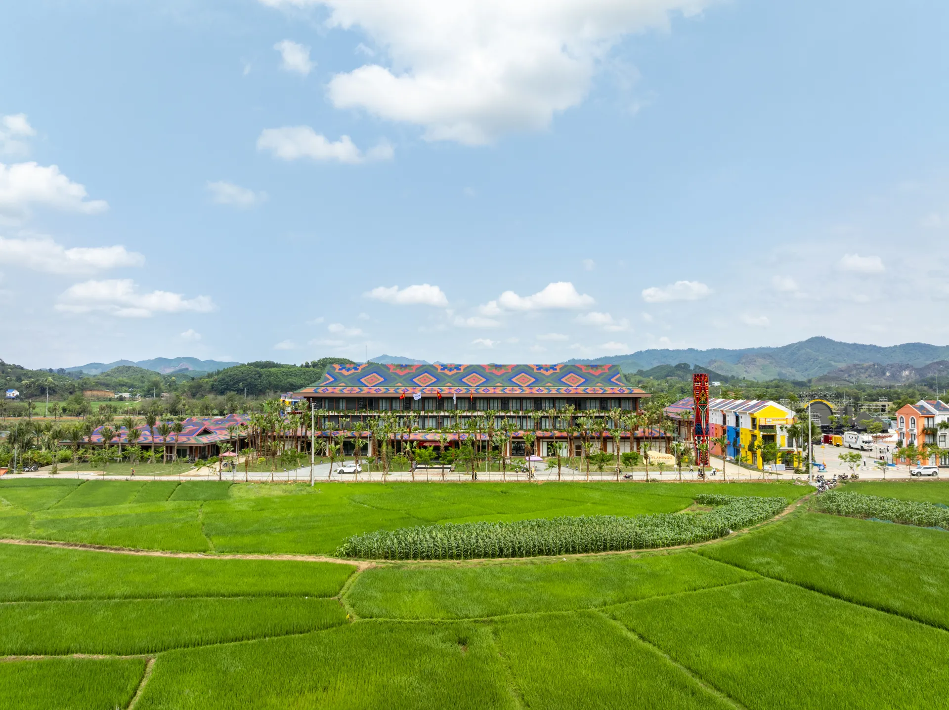 Lấy cảm hứng từ văn hóa bản địa, kiến trúc tại Flamingo Heritage Onsen & Resort hòa quyện tinh tế giữa chất liệu hiện đại và các chi tiết trang trí mang họa tiết thổ cẩm như một cách tôn vinh vẻ đẹp cảnh quan và chiều sâu văn hóa của vùng đất Tuyên Quang. Bên cạnh không gian trưng bày, du khách có thể tham gia chuỗi sự kiện, lễ hội đậm bản sắc văn hóa địa phương, trải nghiệm nghệ thuật dân gian, thưởng thức ẩm thực đặc trưng núi rừng. Tất cả tạo nên một “bầu không khí di sản” sống động, đầy cảm xúc.
