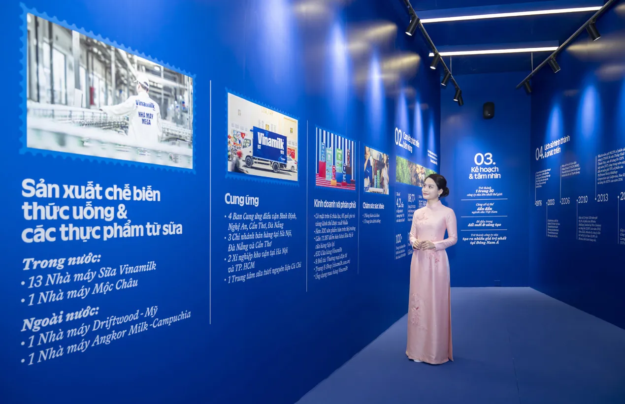 Không chỉ là nơi trưng bày sản phẩm, Vinamilk còn lồng ghép các thông tin về hành trình phát triển của doanh nghiệp - từ những ngày đầu thành lập đến vị thế là Thương hiệu Quốc gia hiện nay, đồng hành sự phát triển của đất nước. Khách tham quan tìm hiểu hành trình phát triển của thương hiệu sữa top 1 Việt Nam. (Ảnh: Vi Nam)
