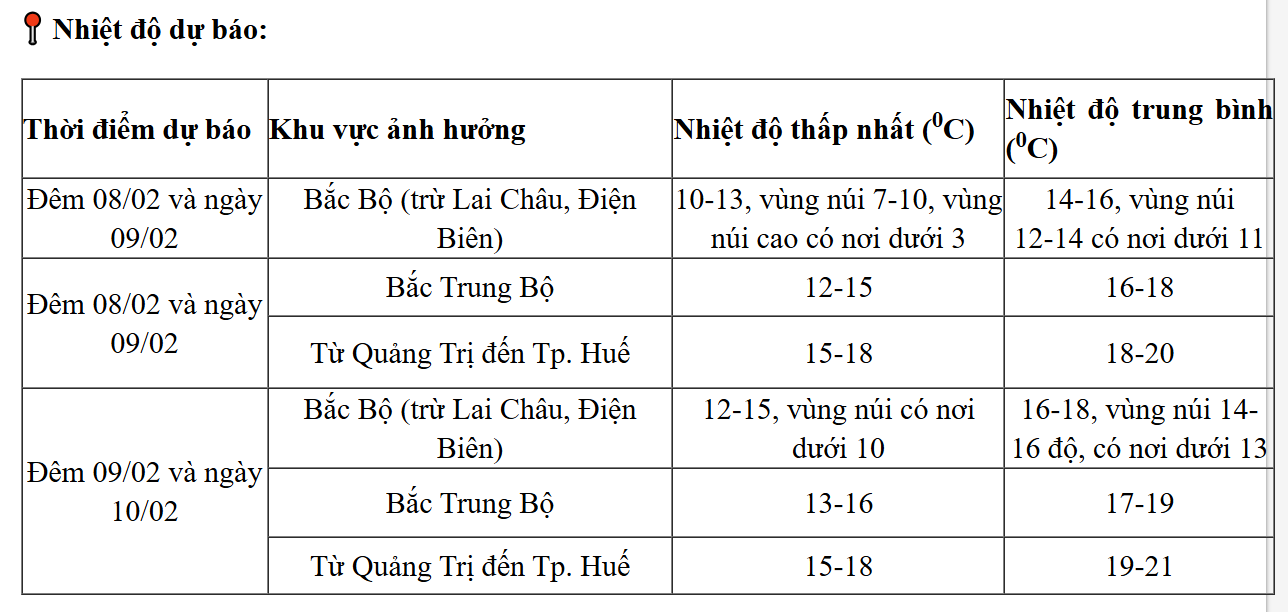 Chiều tối và đêm 08/02, không khí lạnh tiếp tục ảnh hưởng đến các nơi khác ở phía Tây Bắc Bộ và Trung Trung Bộ. Trên đất liền gió Đông Bắc cấp 3, vùng ven biển cấp 3–4. Đêm 8/2 và sáng 9/2, Bắc Bộ, Thanh Hóa và Nghệ An có mưa, mưa rào, có nơi có dông. Đêm 8 đến 9/2, Bắc Bộ trời rét đậm, vùng núi rét hại; khu vực từ Thanh Hóa đến TP Huế trời rét, riêng phía Bắc có nơi rét đậm. Nhiệt độ thấp nhất trong đợt này ở Bắc Bộ phổ biến 10–13 độ C, vùng núi 7–10 độ C, vùng núi cao có nơi dưới 3 độ C; Bắc Trung Bộ phổ biến 12–15 độ C; từ Quảng Trị đến TP Huế phổ biến từ 15-18 độ C.