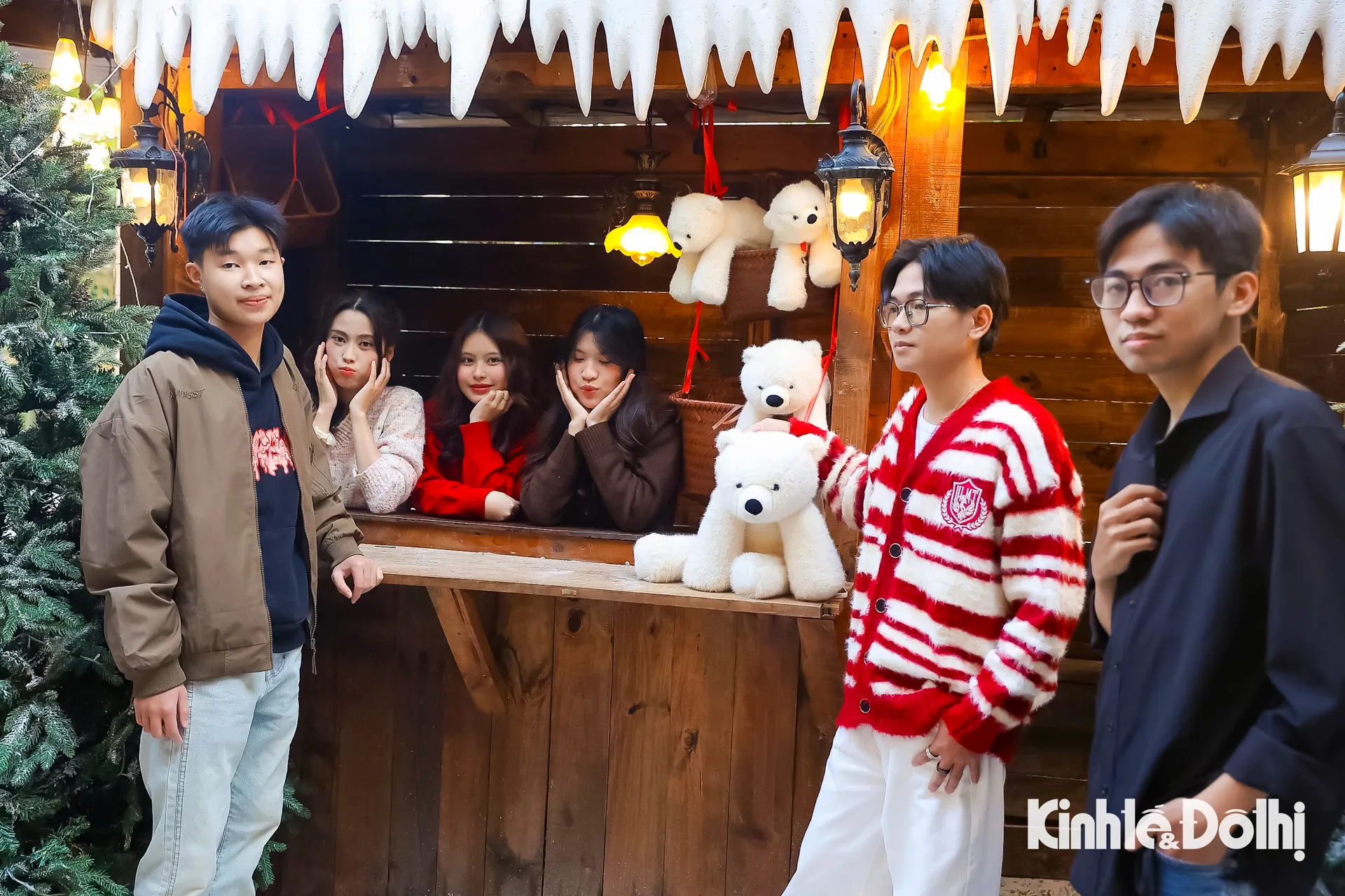 Một nhóm bạn check-in cùng view cây thông lớn và gấu bông đặt giữa khuôn viên quán.