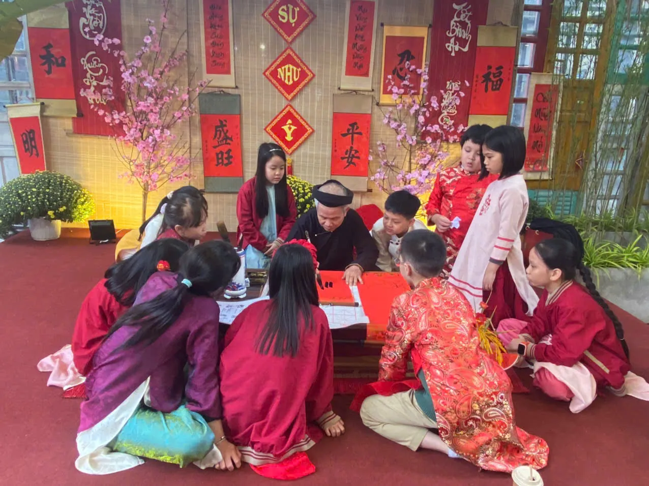 Các em nhỏ chăm chú xem ông đồ viết chữ