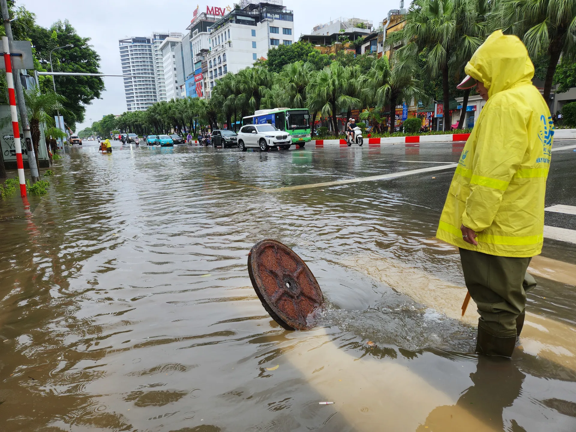 Công nhân Xí nghiệp thoát nước số 1 ứng trực tại điểm ngập úng trên phố Nguyễn Chí Thanh. Ảnh: Hải Linh