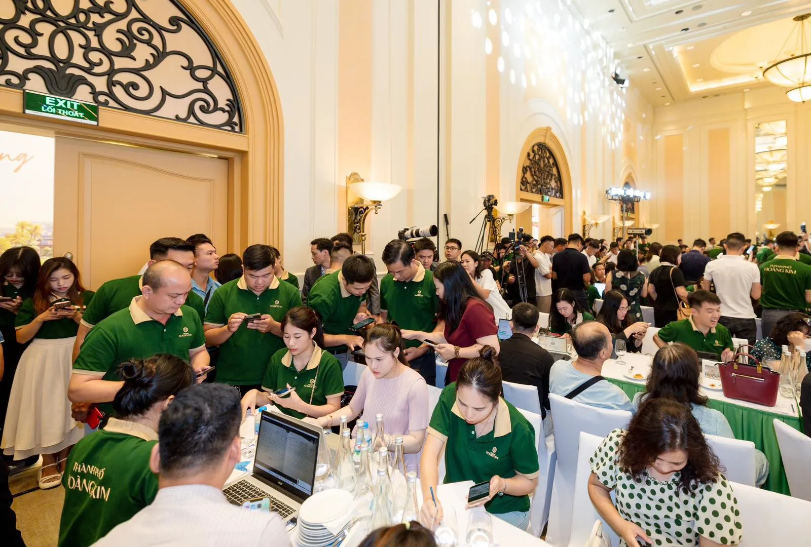 Ngay từ sáng sớm, hội trường sự kiện đã kín chỗ, hàng trăm nhà đầu tư từ Hà Nội, Hải Phòng và nhiều tỉnh thành lân cận có mặt, tạo nên không khí sôi động ngay trước giờ công bố bảng hàng. Từng ánh mắt chăm chú dõi theo, từng tràng pháo tay vang lên mỗi khi một giao dịch thành công được xác nhận, khiến bầu không khí trong hội trường nóng lên từng giây.
