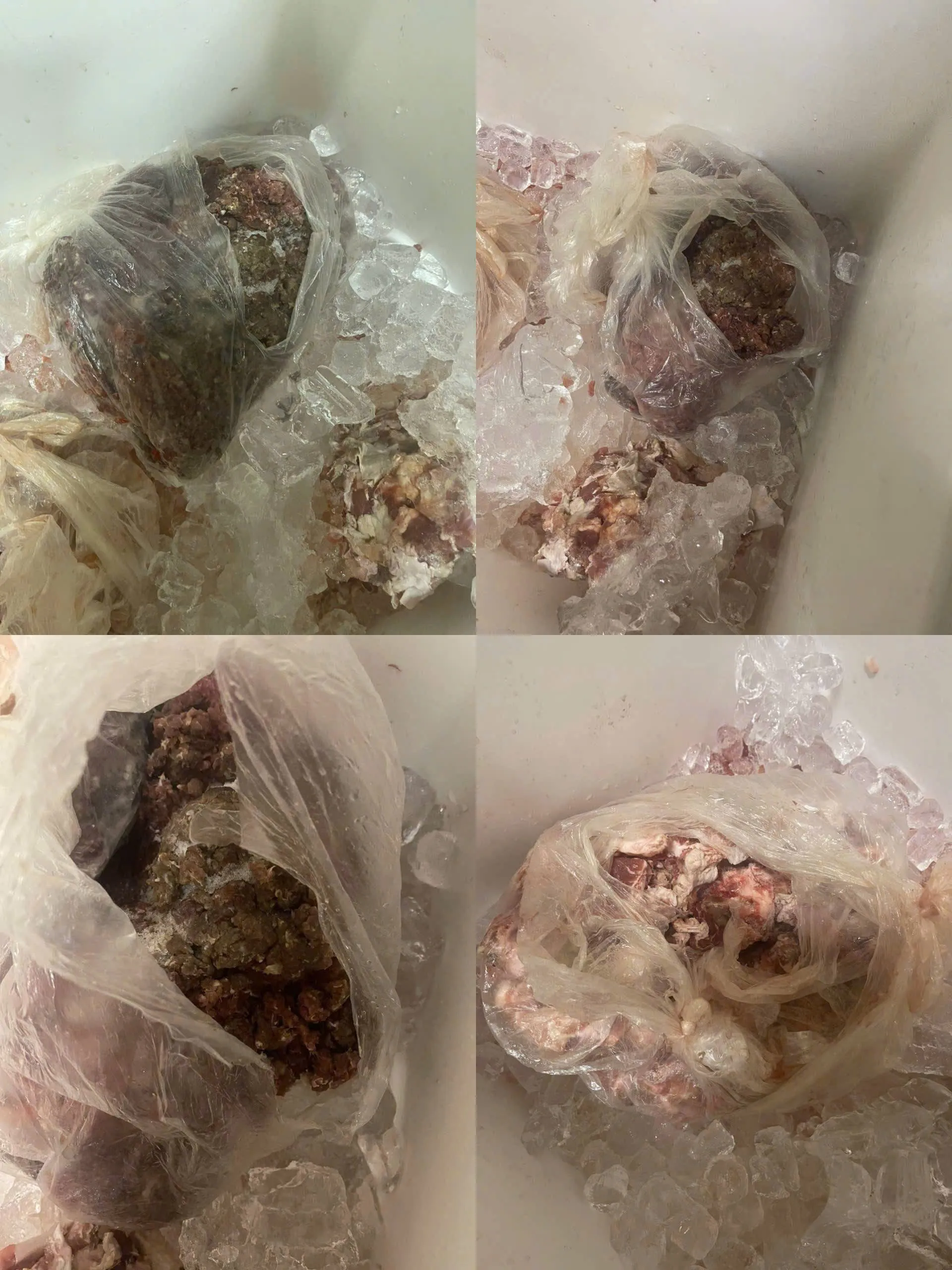 Những phần thực phẩm này được mô tả là có màu sắc và mùi không tươi ngon, xương có dấu hiệu ôi. Ngoài ra, tại bếp còn có nồi chứa dầu ăn thải chưa được loại bỏ và không có nhãn nhận biết rõ ràng.