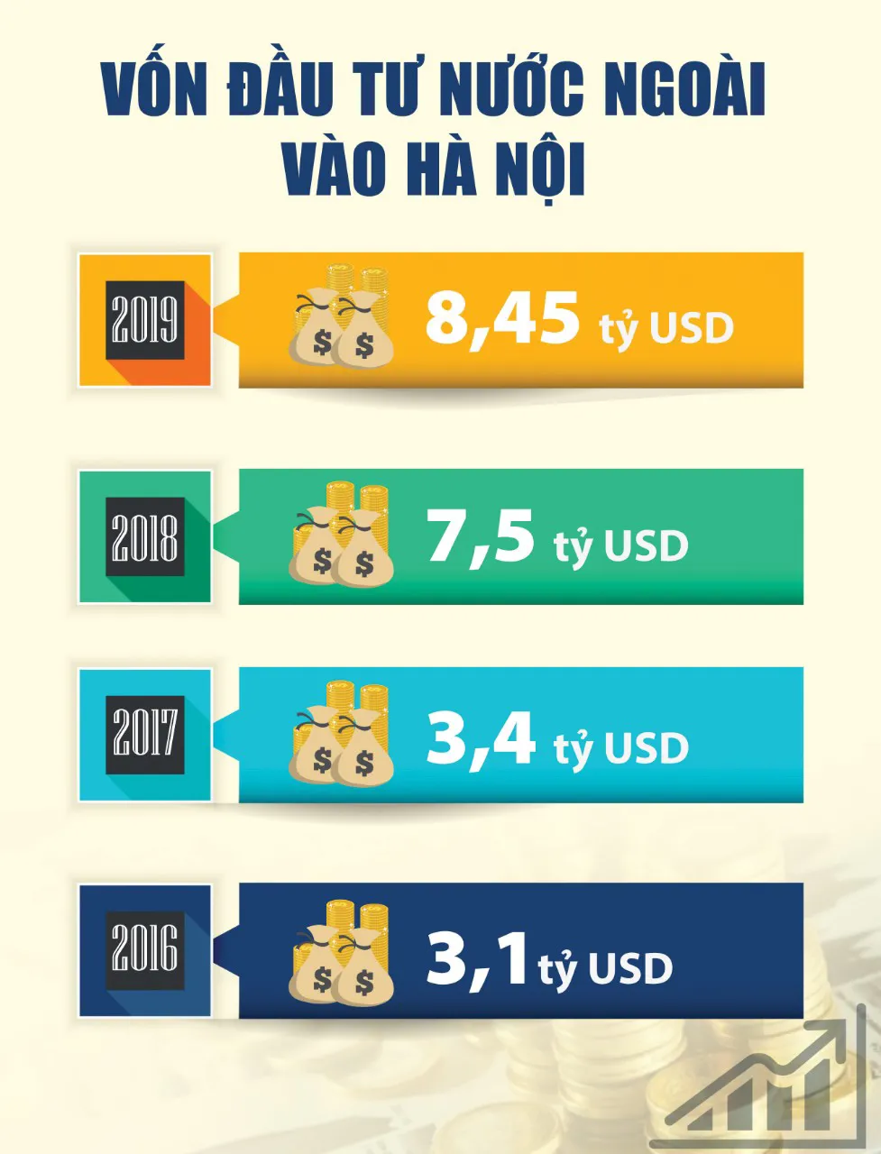 Năm 2019, GRDP của Hà Nội tăng 7,62% - cao nhất trong 10 năm qua. Thu ngân sách Nhà nước năm 2019 của TP đạt 101,8% dự toán, tăng 8,8% so với năm 2018. Đóng góp 19,37% tăng trưởng GDP cả nước và 18,7% tổng thu ngân sách của Nhà nước. Môi trường đầu tư, kinh doanh tiếp tục được cải thiện. Vốn đầu tư phát triển ước tăng tăng 13,5% so với năm 2018 (kế hoạch từ 10,5 – 11%), đặc biệt thu hút đầu tư nước ngoài đạt 8,46 tỷ USD, cao nhất sau hơn 30 năm đổi mới, hội nhập, là năm thứ 2 liên tiếp dẫn đầu cả nước.