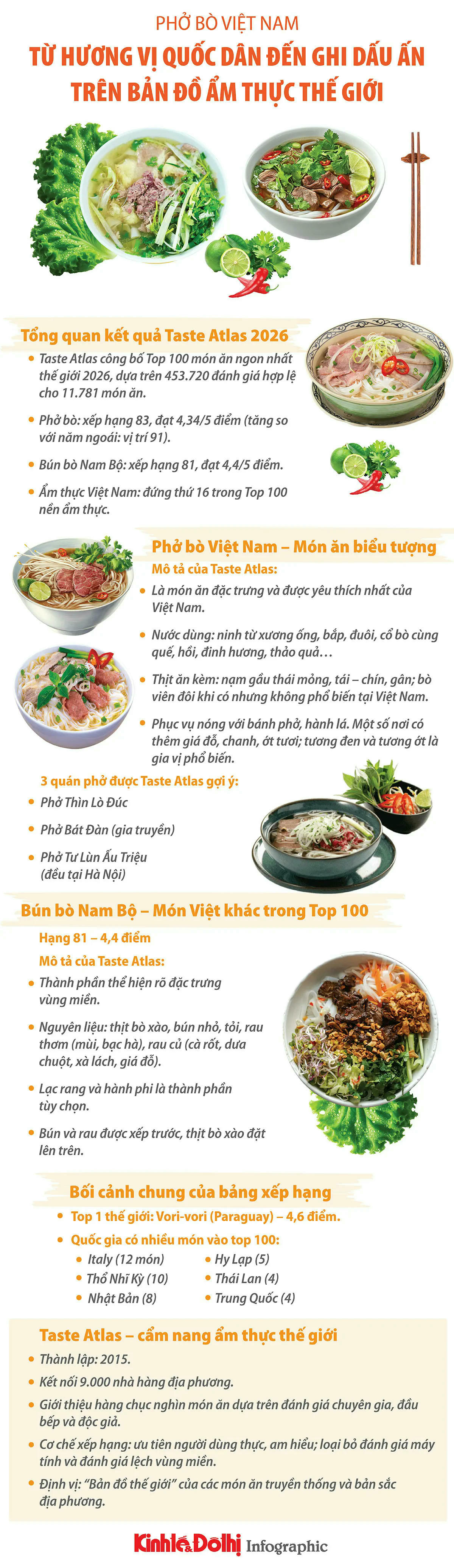 Sáng 6/12, Taste Atlas đã công bố danh sách 100 món ăn ngon nhất thế giới 2026 (Best Dishes in the world 2026) nằm trong chuỗi giải thưởng thường niên của cẩm nang ẩm thực hàng đầu thế giới. Phở bò xuất hiện trong bảng xếp hạng được mong chờ nhất năm của Taste Atlas ở vị trí 83.