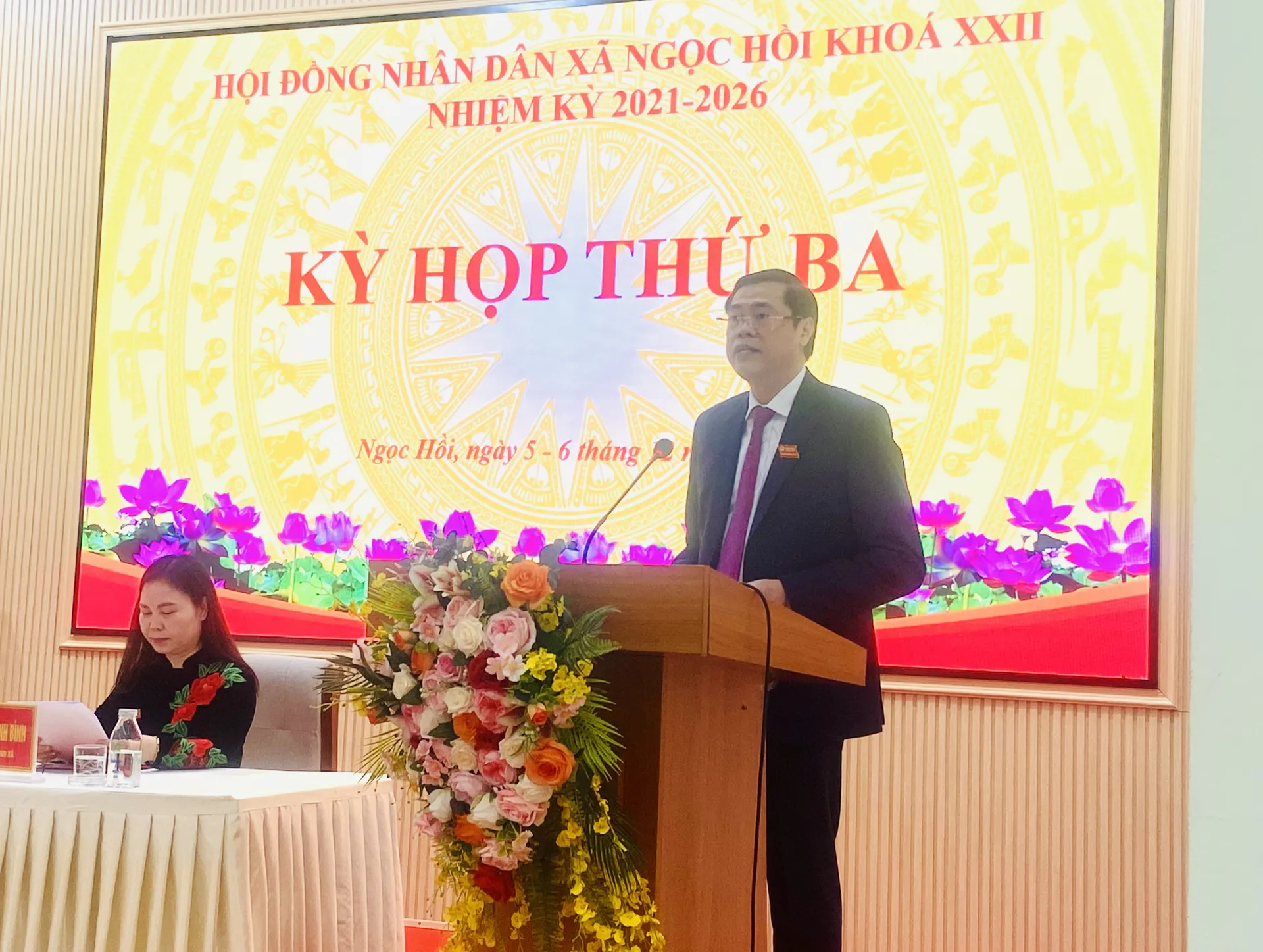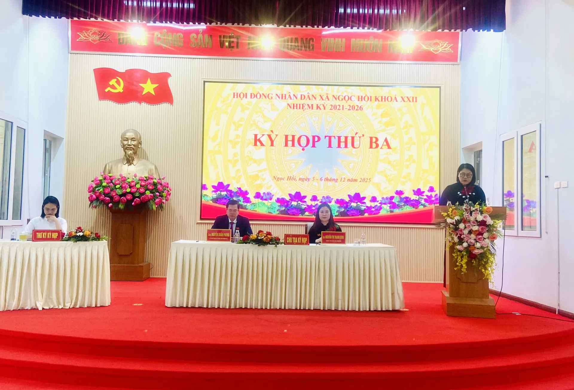 Sau một ngày làm việc nghiêm túc, dân chủ và trách nhiệm, Kỳ họp thứ Ba HĐND xã Ngọc Hồi khóa XXII đã hoàn thành toàn bộ chương trình đề ra. Kỳ họp thống nhất thông qua 13 báo cáo và 07 dự thảo Nghị quyết quan trọng, trong đó có: Kế hoạch phát triển kinh tế – xã hội năm 2026; Dự toán, phân bổ ngân sách; Kế hoạch phát triển giáo dục; Điều chỉnh biên chế công chức; Giao chỉ tiêu biên chế hành chính sự nghiệp; Tổ chức lại trung tâm Văn hóa - Thông tin và Thể thao xã...