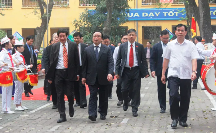 | Bí thư Thành ủy Hoàng Trung Hải và các đại biểu đến dự lễ kỷ niệm 55 năm ngày Bác Hồ về thăm phường Kim Liên, quận Đống Đa. |