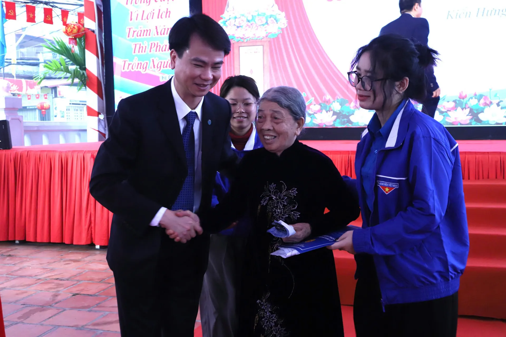 Bí thư Đảng ủy, Chủ tịch HĐND phường Kiến Hưng Nguyễn Tiến Quyết chúc mừng bà Vũ Thị Cam nhân Kỷ niệm 60 năm Ngày Bác Hồ về thăm Văn Phú.
