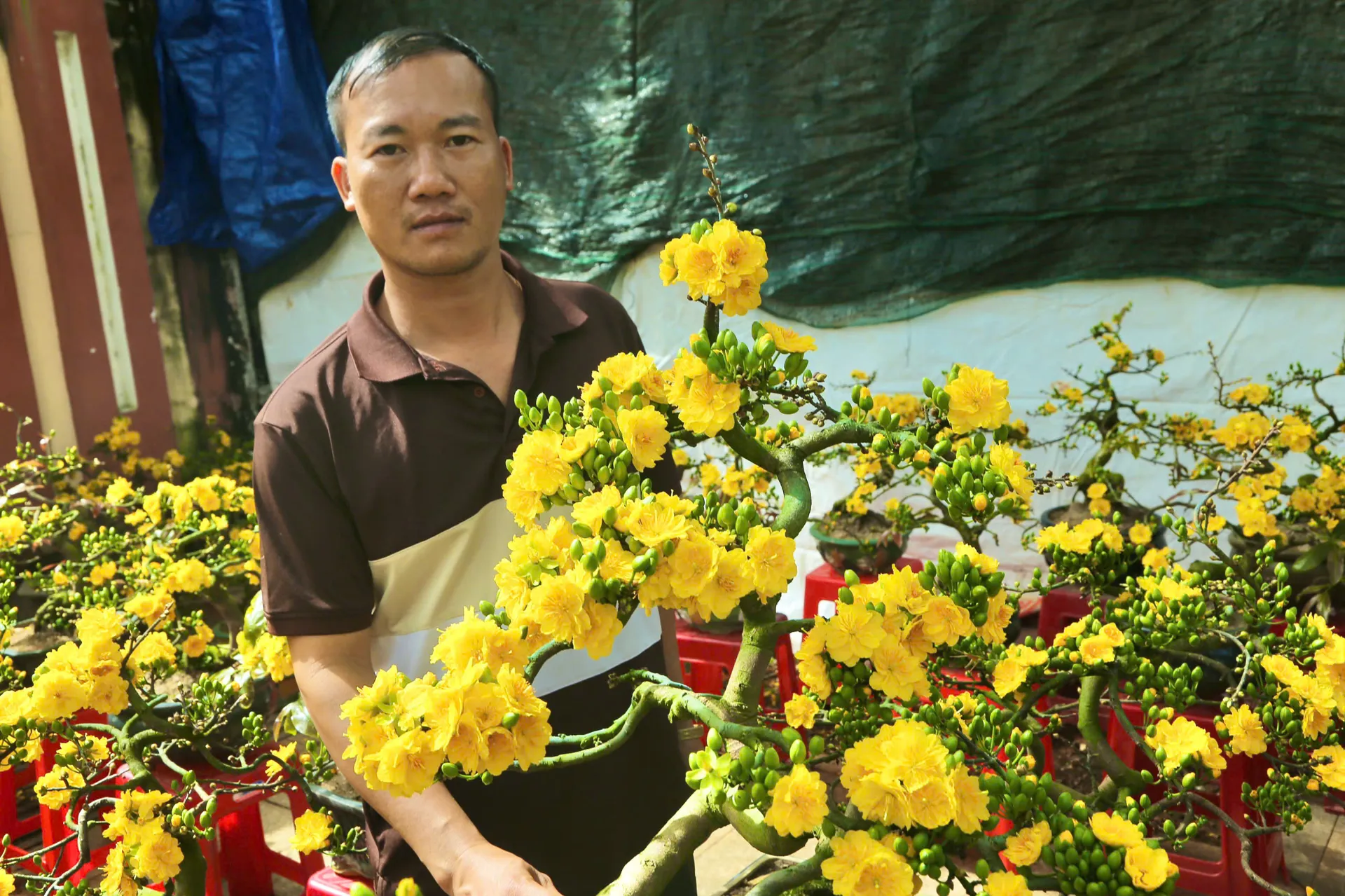 Giữa muôn vàn sắc hoa Xuân, dòng “mai cúc” của nhà vườn anh Phạm Văn Tứ (xã Ea Khanh, tỉnh Đắk Lắk) vẫn khẳng định được vị thế riêng nhờ vẻ đẹp rực rỡ và khác biệt. Những gốc mai bonsai tại đây sở hữu sắc vàng kim tươi mới, nụ hoa mọc dày và kích thước bông vượt trội, mang lại sự sung túc cho gia chủ. Anh Tứ cho biết, mỗi gốc mai là kết quả của một quá trình bón phân và chăm sóc kỳ công, khác biệt hoàn toàn với dòng mai truyền thống. Với 120 cây bonsai tâm huyết được vận chuyển thẳng từ vườn nhà, mai cúc không chỉ chinh phục khách hàng bằng độ bền hoa cực cao mà còn bởi giá trị nghệ thuật và kinh tế xứng đáng với sự đầu tư của người chơi hoa.