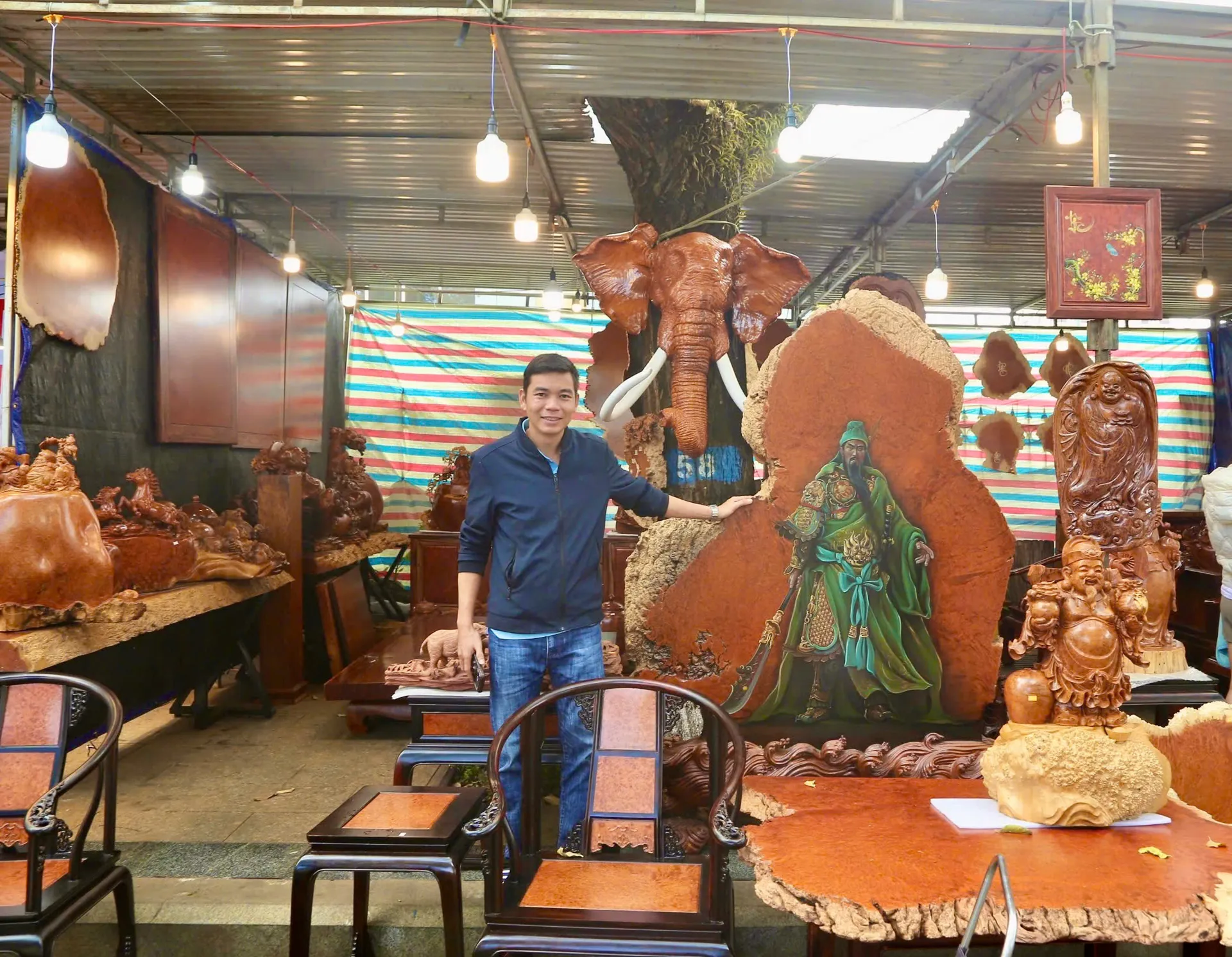 Các gian hàng đồ gỗ mỹ nghệ cũng tạo nên một sức hút khó cưỡng đối với du khách. Dưới đôi bàn tay tài hoa của các nghệ nhân, những khối gỗ thô mộc đã “thay da đổi thịt” thành các tác phẩm nghệ thuật sống động, từ những bức tượng linh vật uy nghi đến những món đồ nội thất tinh xảo. Mỗi sản phẩm là sự kết hợp hoàn hảo giữa vẻ đẹp nguyên bản của đại ngàn và kỹ thuật chạm trổ tỉ mỉ, không chỉ mang giá trị thẩm mỹ cao mà còn gửi gắm mong ước về bình an, thịnh vượng cho gia chủ. Sự góp mặt của những mảng màu mộc mạc ấy đã làm phong phú thêm không gian lễ hội, thu hút đông đảo bước chân người thưởng lãm.