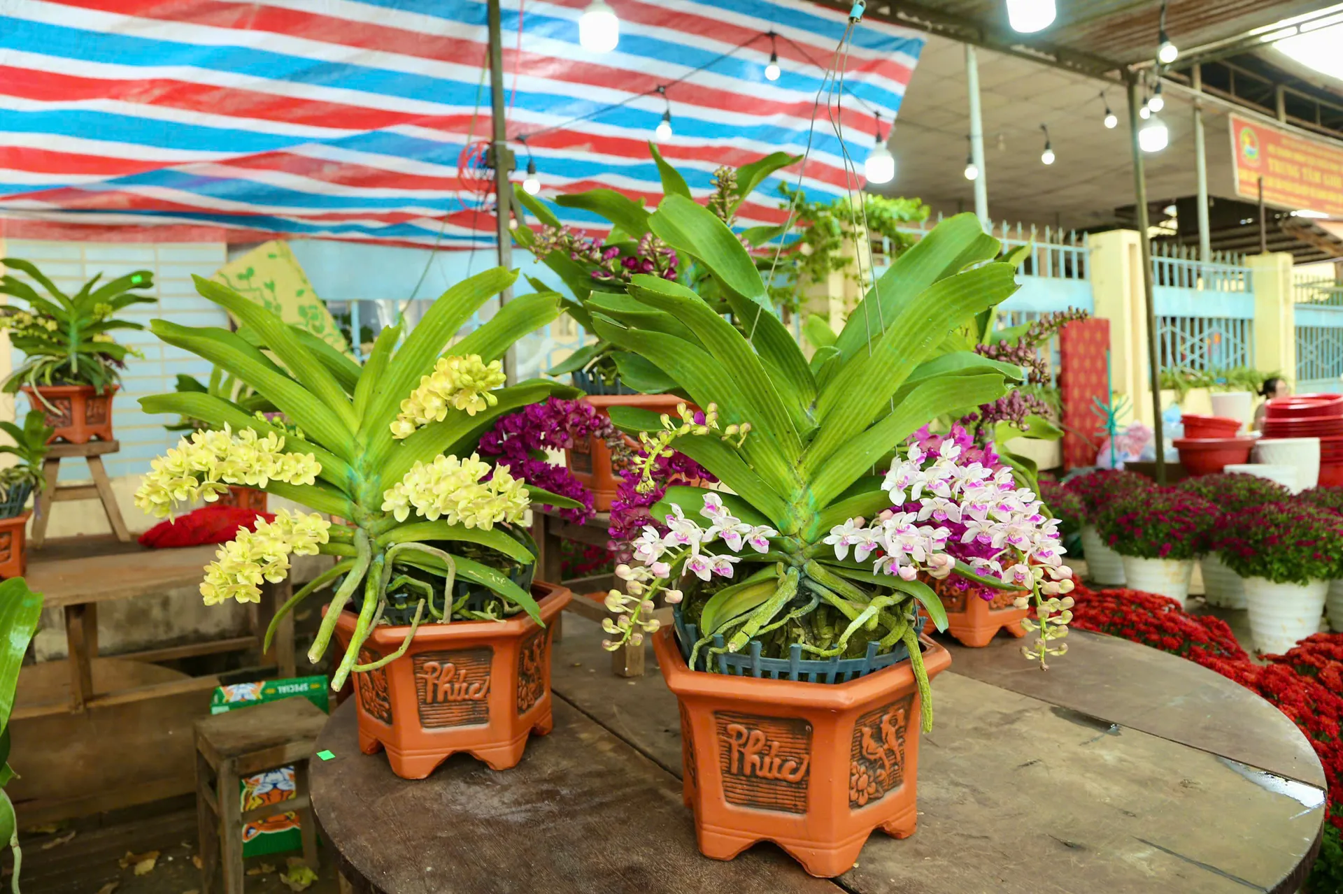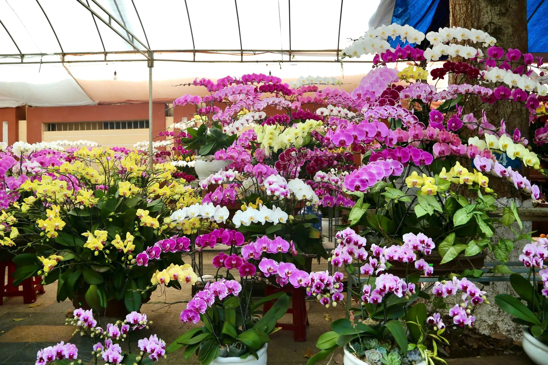 Ngoài những giò lan rừng là biểu tượng cho nét đẹp đại ngàn, những chậu lan Hồ Điệp tại chợ hoa Xuân lại mang đến một vẻ đẹp kiều diễm, sang trọng và đầy quý phái. Từng cánh hoa mịn màng như nhung, xếp chồng lên nhau một cách tinh tế với đủ sắc màu rực rỡ từ trắng tinh khôi, vàng phú quý đến hồng cánh sen nồng nàn. Dưới ánh nắng Xuân, những cành hoa vươn dài, uốn lượn mềm mại như những đàn bướm xinh đẹp đang dập dìu bay lượn, tạo nên một không gian nghệ thuật đầy lôi cuốn. Không chỉ sở hữu vẻ ngoài hoàn mỹ, lan Hồ Điệp còn tượng trưng cho sự thịnh vượng và hạnh phúc vẹn tròn, trở thành lựa chọn ưu tiên để người yêu hoa gửi gắm những ước nguyện tốt lành cho một năm mới an khang.