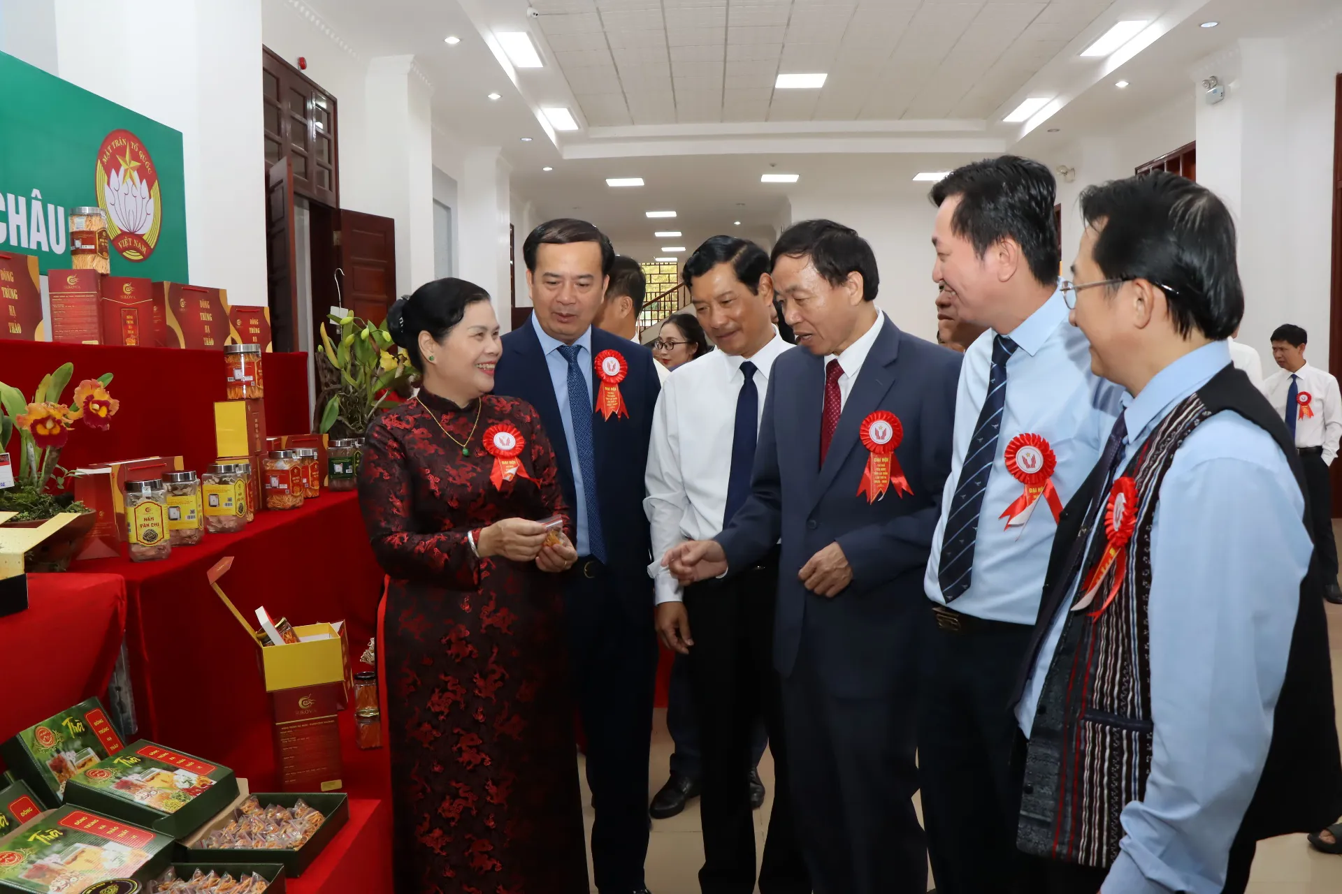 Các đồng chí lãnh đạo Trung ương, lãnh đạo tỉnh, các sở, ngành tham quan không gian trưng bày các sản phẩm OCOP. Ảnh: Vương Trang