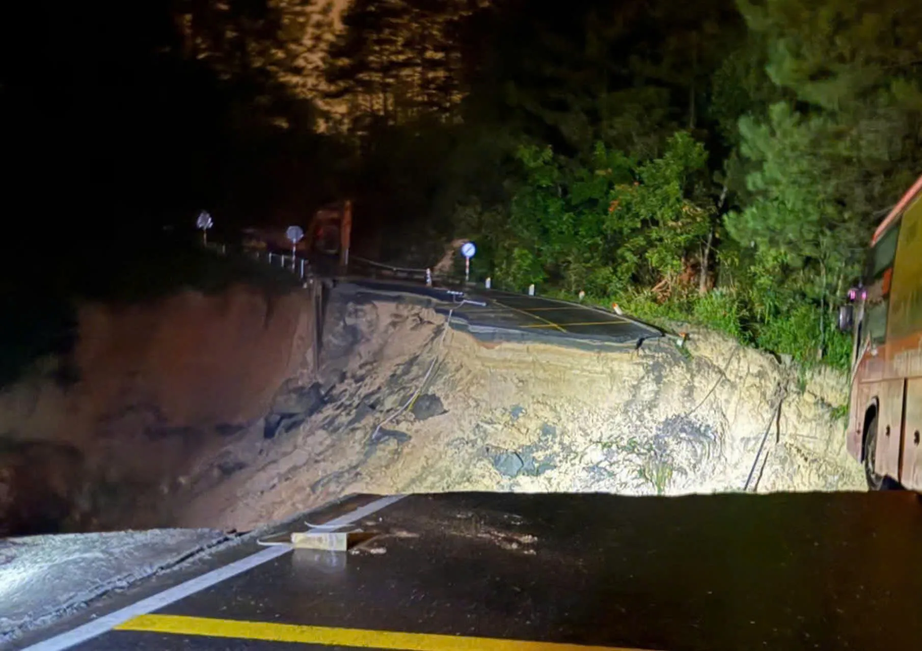 Lực lượng cứu hộ tiếp cận điểm sụt lún tại Km 226+500 đèo Mimosa trong đêm 19/11, mặt đường bị tách rời hoàn toàn.