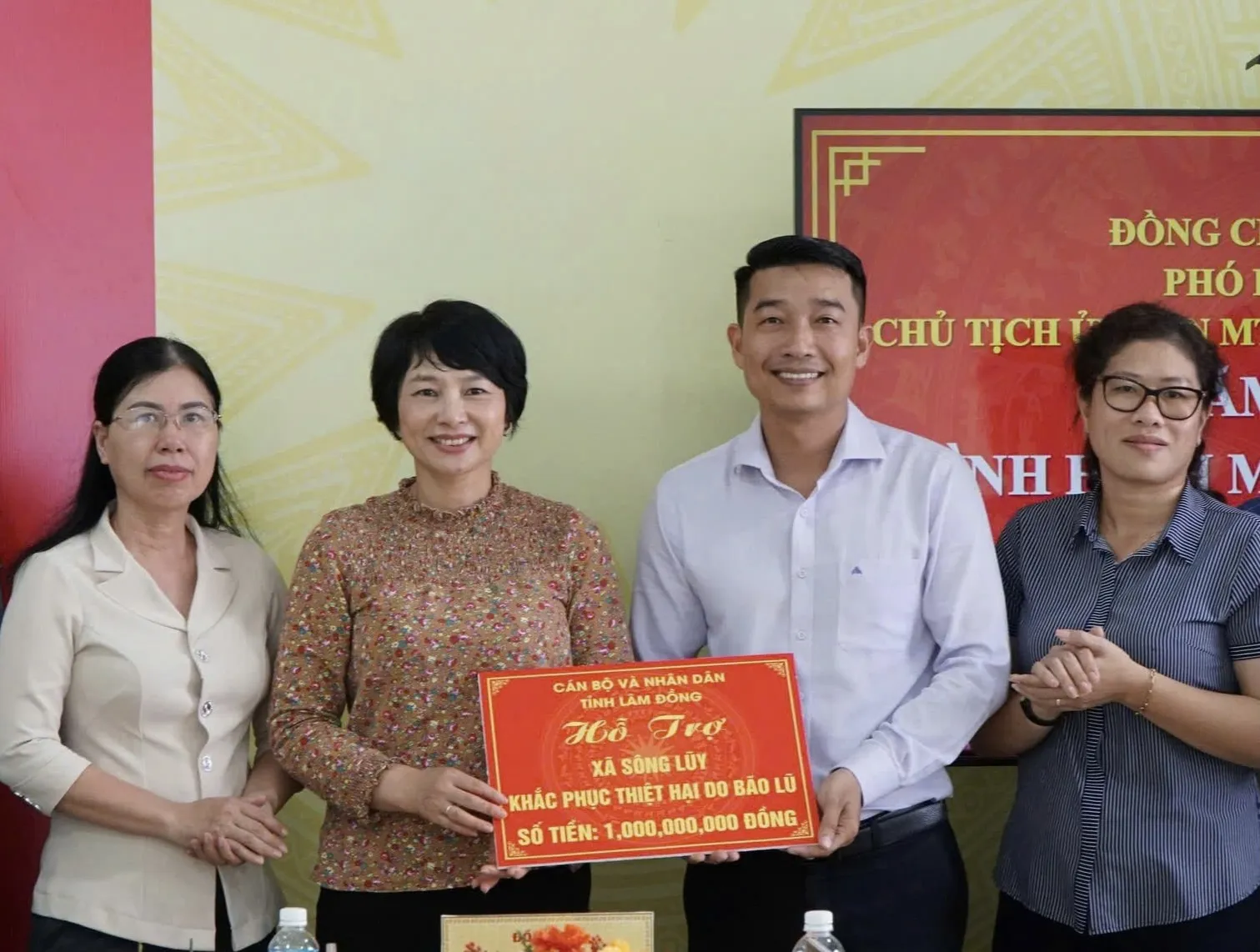 Phó Bí thư Tỉnh ủy, Chủ tịch Ủy ban MTTQ Việt Nam tỉnh Lâm Đồng Phạm Thị Phúc trao tiền hỗ trợ cho xã Sông Lũy.