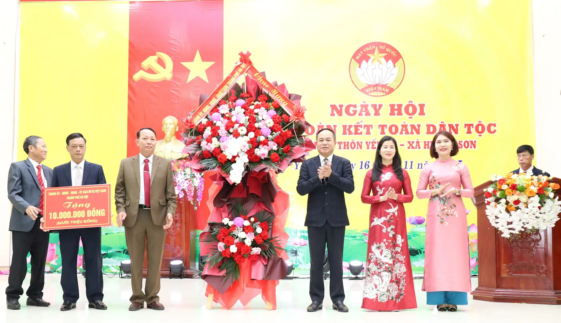 Bí thư Đảng ủy, Chủ tịch HĐND xã Hương Sơn Trần Đức Hải trao hoa và quà của xã tặng Nhân dân thôn Yến Vỹ tại ngày hội.