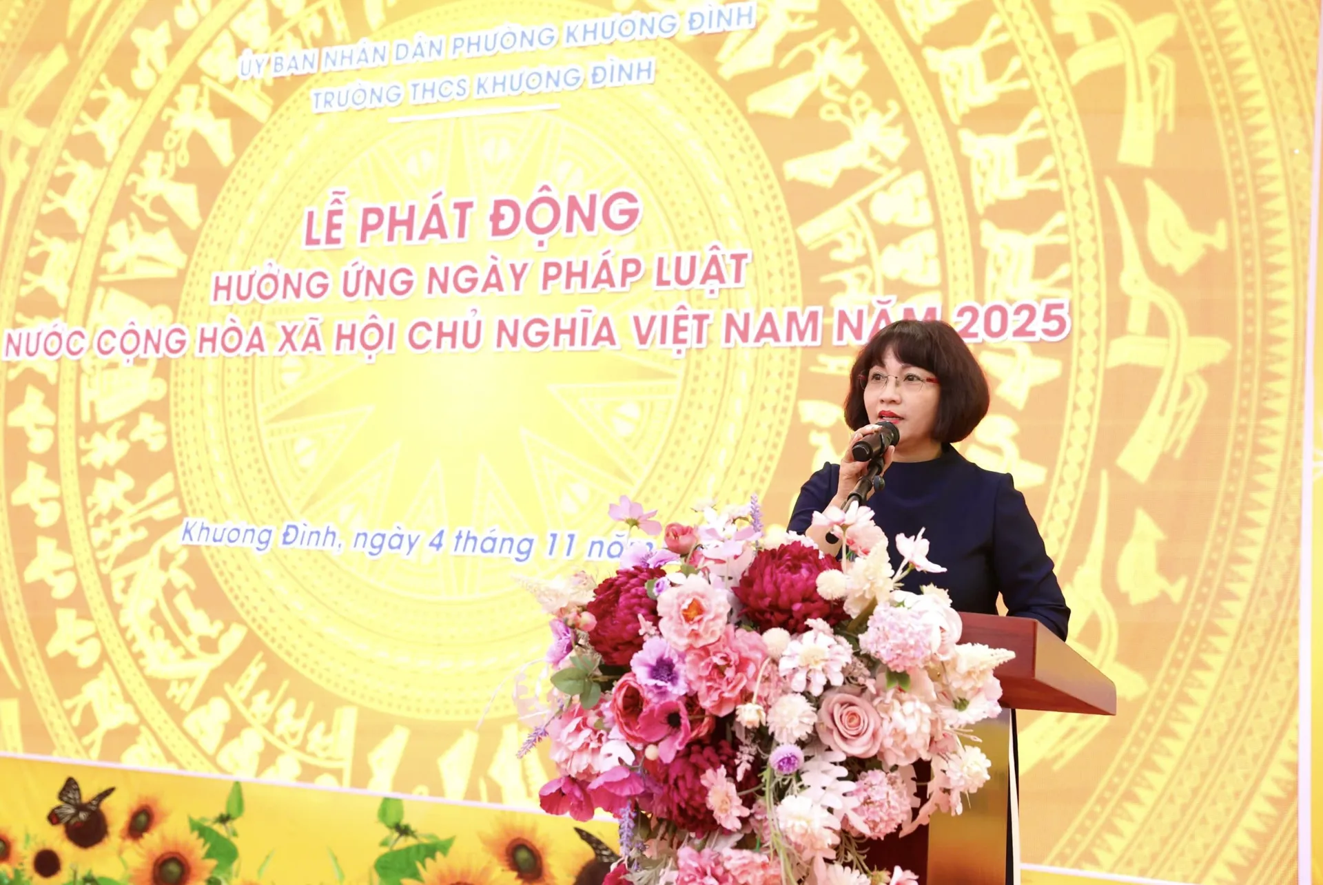 Phát biểu tại buổi lễ, Phó Chủ tịch UBND phường Khương Đình Đỗ Văn Khải kêu gọi: “Mỗi nhà trường, giáo viên và học sinh hãy phát huy tinh thần chủ động, sáng tạo, tích cực hưởng ứng Ngày Pháp luật Việt Nam, coi đây là việc làm hàng ngày, thường xuyên". Đồng thời kêu gọi mỗi thầy cô, mỗi em học sinh hãy là “tuyên truyền viên nhỏ”, góp phần lan tỏa tinh thần thượng tôn pháp luật trong cộng đồng.