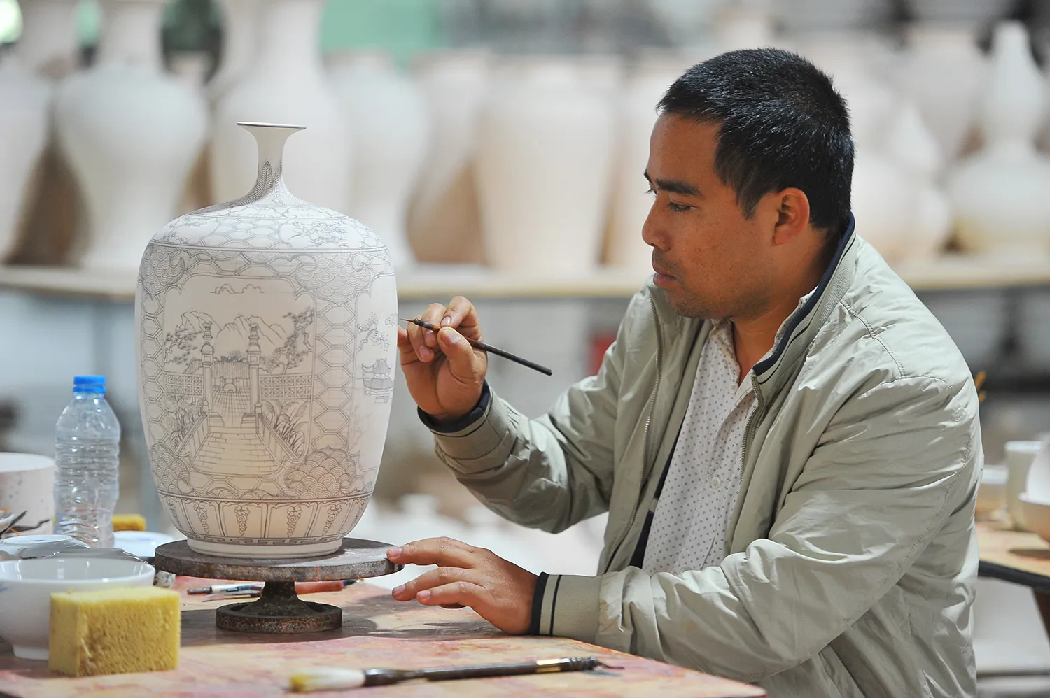 Nghệ nhân vẽ họa tiết trên sản phẩm gốm Bồ Bát. Ảnh: TTXVN