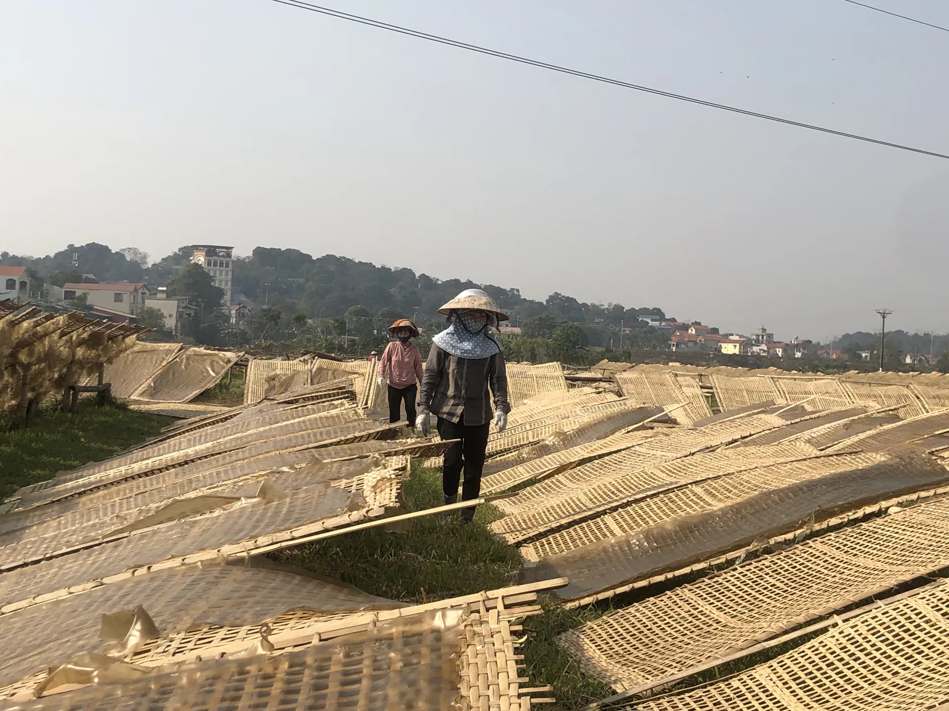 Những ngày giáp Tết, không khí sản xuất tại làng nghề miến dong làng So, xã Tân Hòa, huyện Quốc Oai vô cùng tất bật, rộn rã. Đi từ đầu làng đã thấy các giàn miến phơi trắng phau cả cánh đồng. Bên trong những xưởng sản xuất, tiếng máy tráng bánh hòa tiếng nói cười của công nhân lao động rộn ràng.