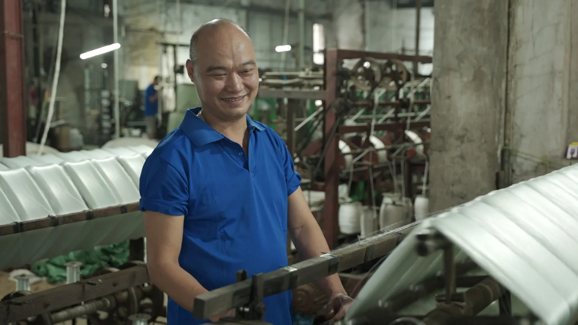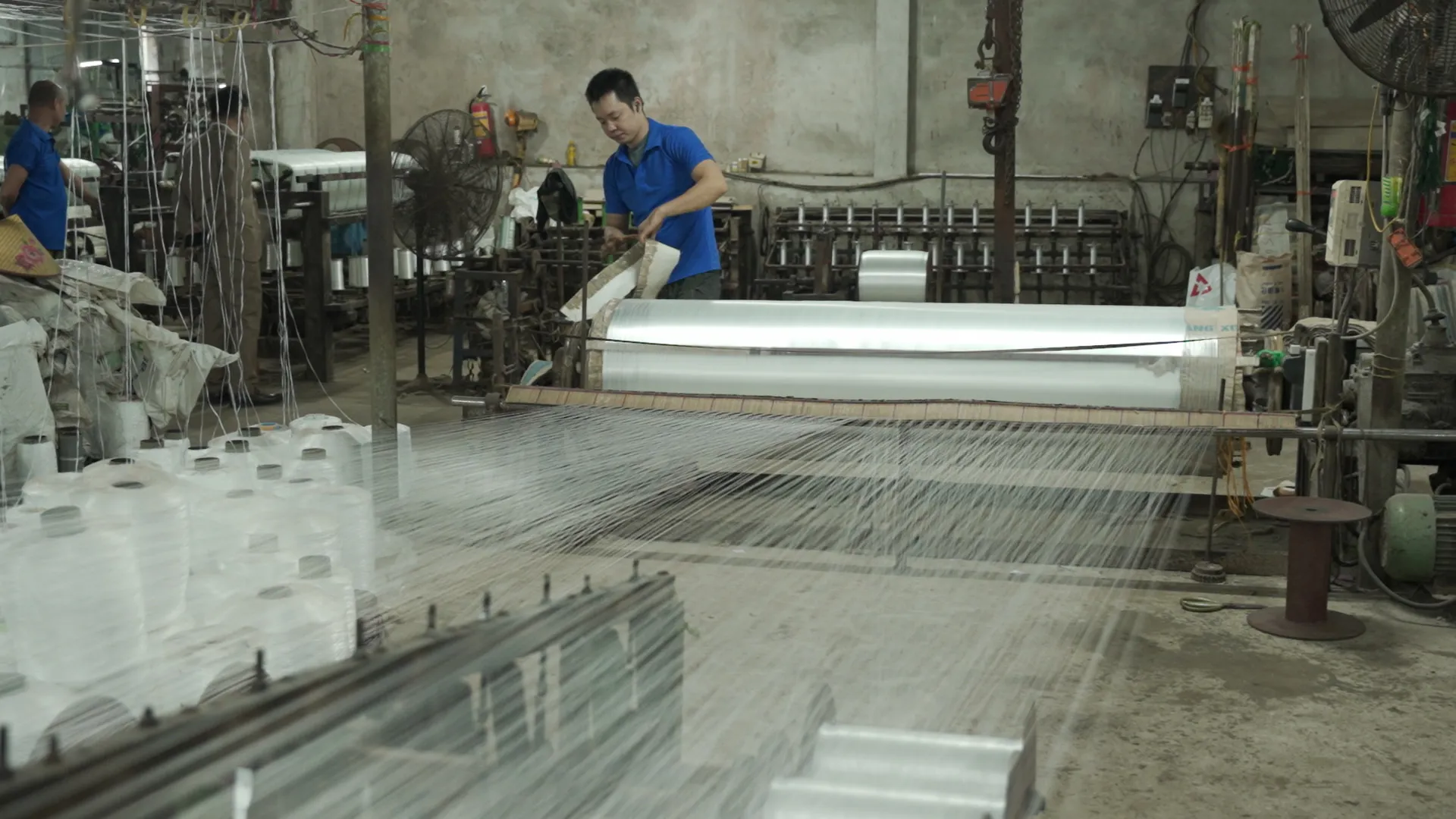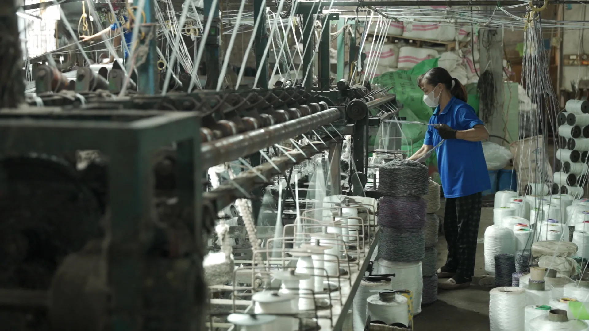 Người lao đông đang miệt mài sản xuất lưới cước tại thôn Trần Phú