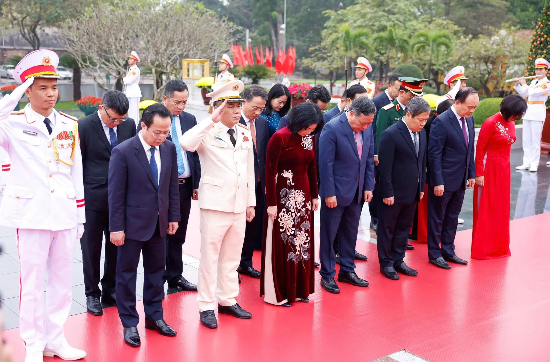 Trong không khí trang nghiêm, Đoàn đại biểu nghiêng mình tưởng nhớ những người con ưu tú của dân tộc đã không tiếc xương máu, dũng cảm chiến đấu, hy sinh vì sự nghiệp đấu tranh giải phóng dân tộc, vì nền độc lập tự do của Tổ quốc, vì hạnh phúc của Nhân dân.