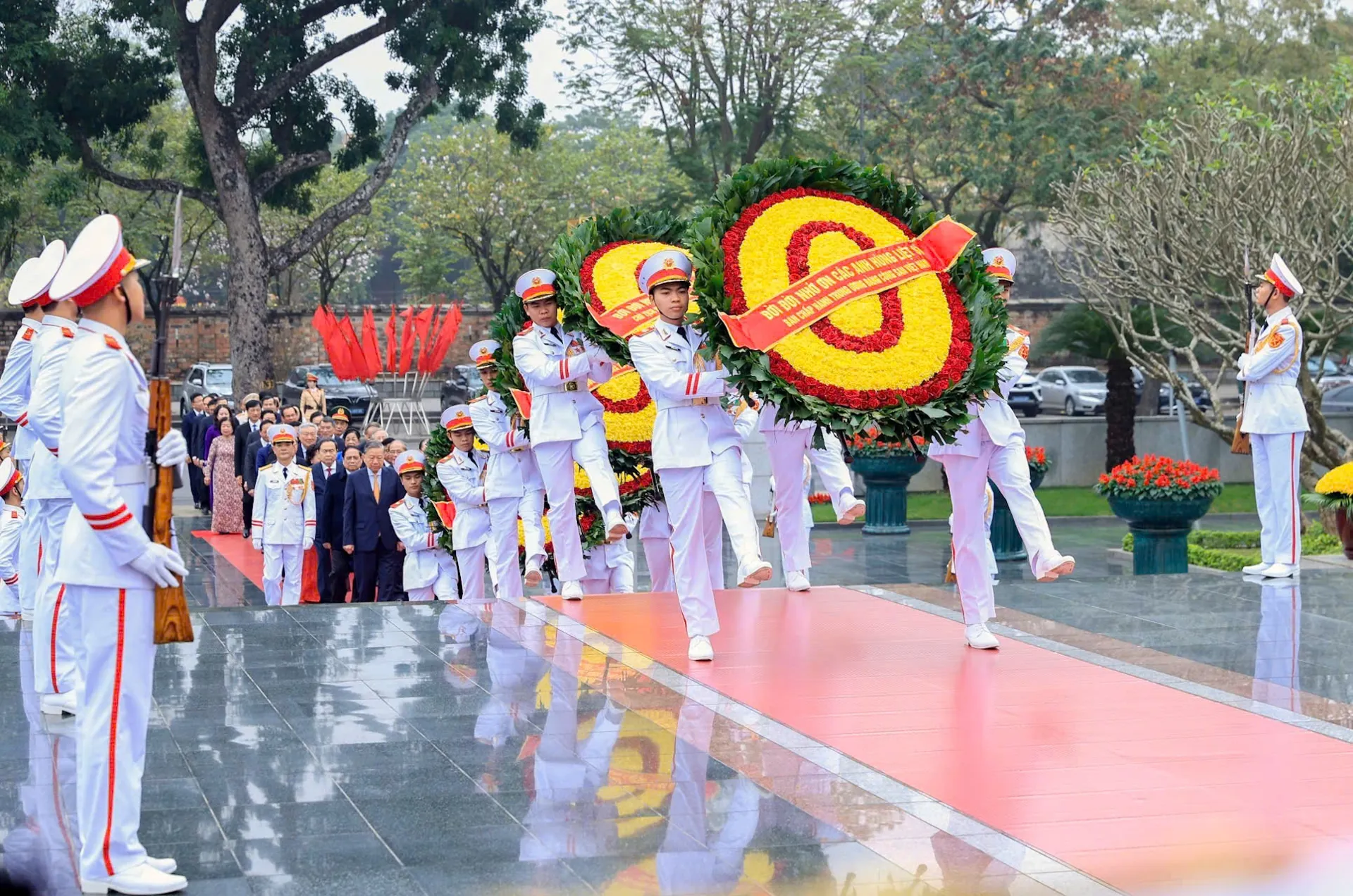 Các đồng chí lãnh đạo Đảng, Nhà nước đặt vòng hoa, dâng hương, tưởng niệm các Anh hùng liệt sĩ.