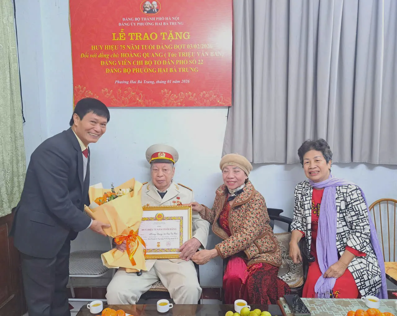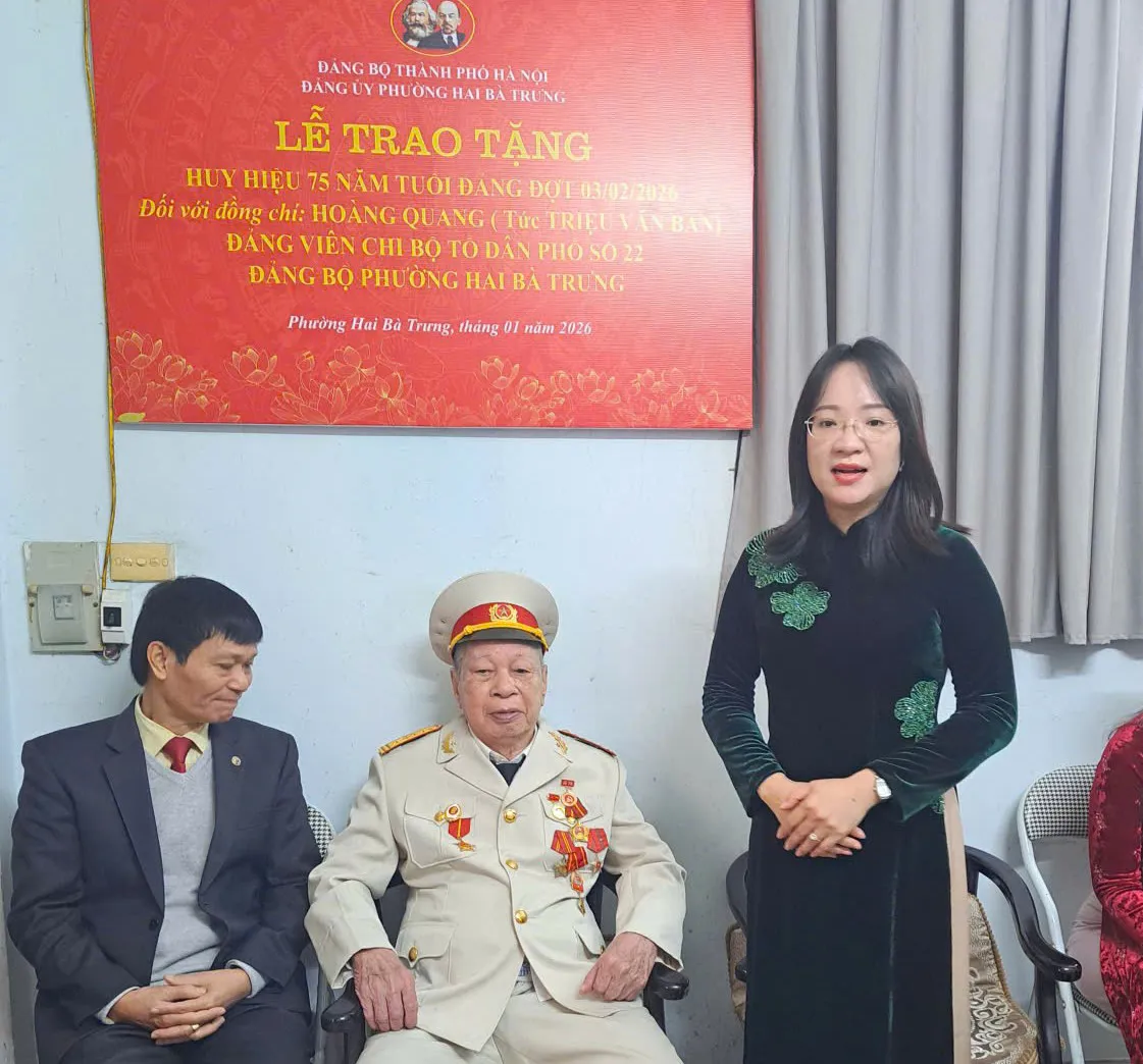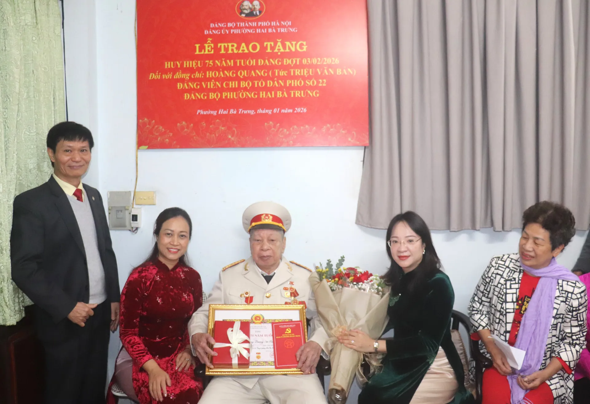 Trong đó, sáng nay, Phó Bí thư Thường trực Đảng ủy phường đã trân trọng trao Huy hiệu 75 năm tuổi Đảng tặng đảng viên Hoàng Quang (Triệu Văn Bản), hiện ở tại số 4 phố Yexanh, sinh hoạt tại Chi bộ Tổ dân phố 22 phường Hai Bà Trưng, Hà Nội. Đồng chí sinh năm 1930, vào Đảng ngày 3/3/1952; quê quán tại xã Bình Yên, tỉnh Thái Nguyên.