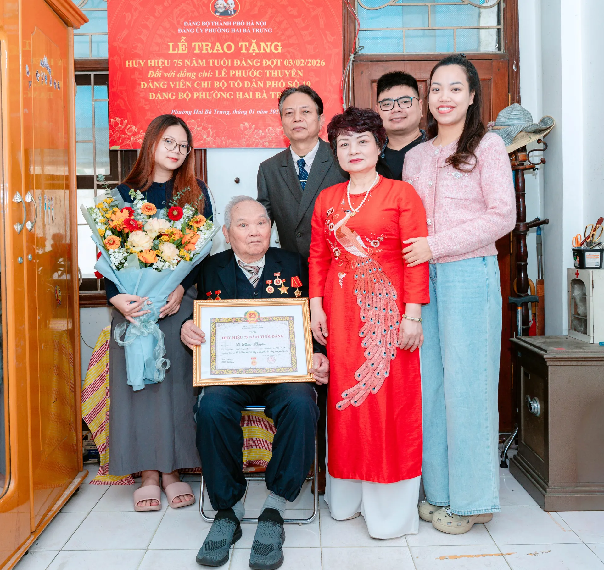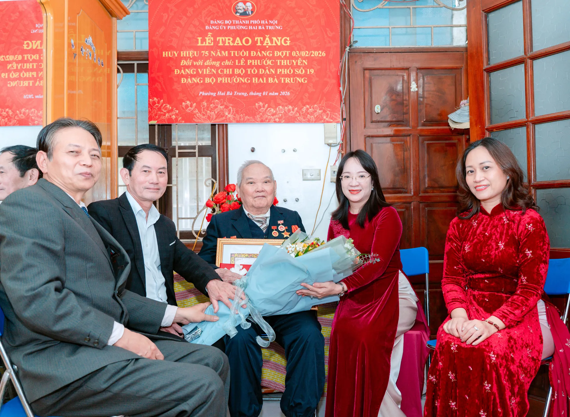 Thừa ủy quyền của Ban Thường vụ Thành ủy Hà Nội, Phó Bí thư Thường trực Đảng ủy phường Hai Bà Trưng Nguyễn Xuân Diệp trao Huy hiệu 75 năm tuổi Đảng tặng đồng chí Lê Phước Thuyên