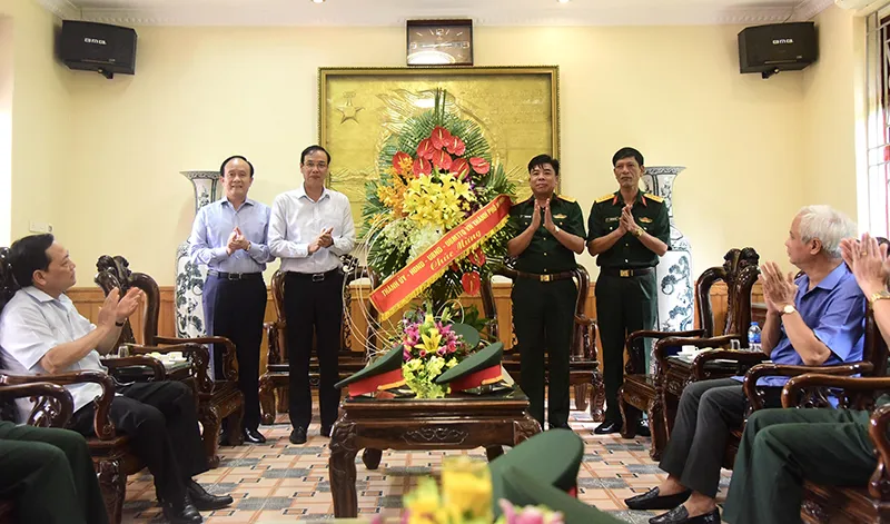 | Phó Bí thư Thành ủy Đào Đức Toàn tặng hoa chúc mừng cán bộ, chiến sĩ Trung đoàn Bộ binh cơ giới 102. |
