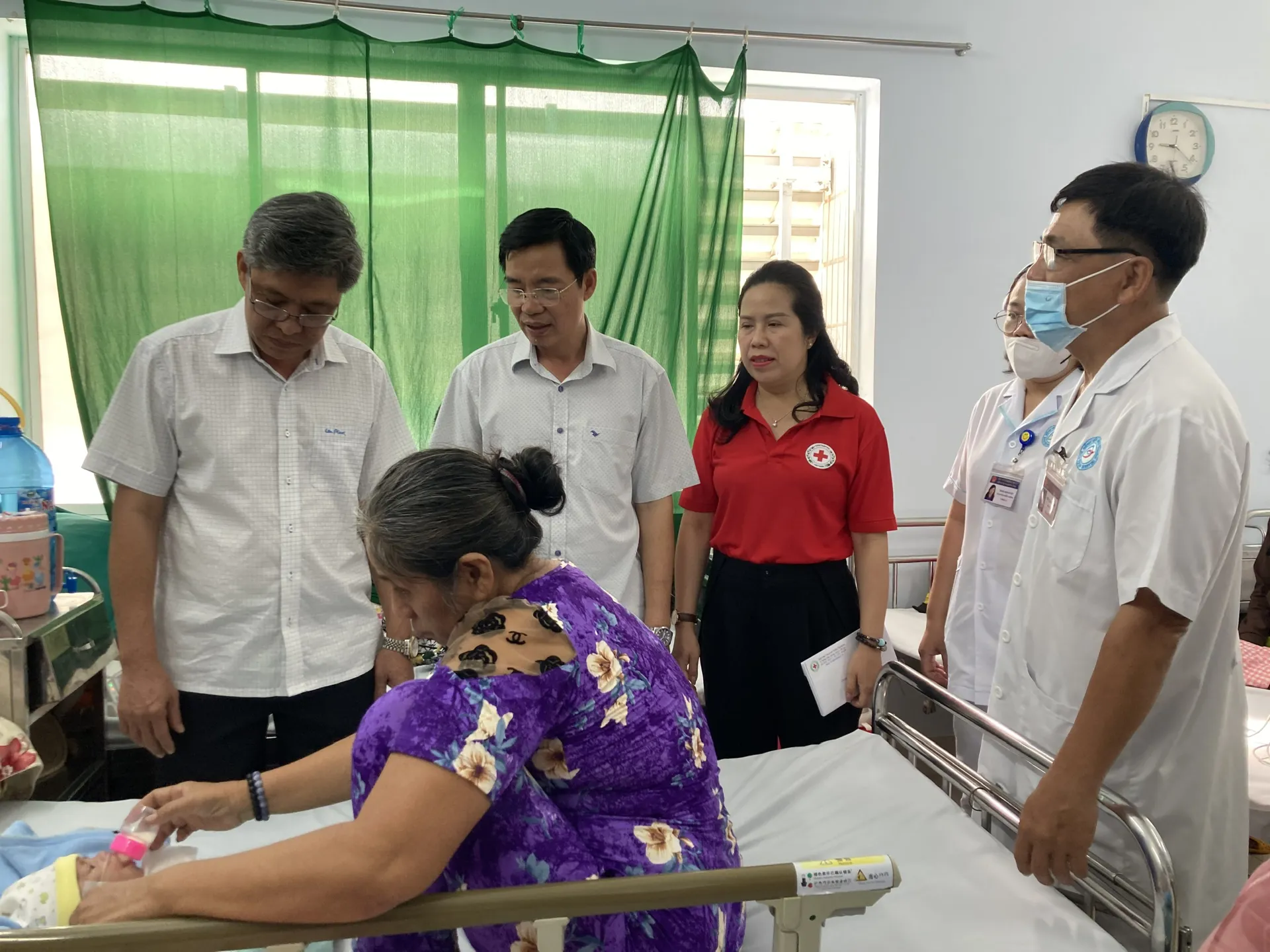 Đoàn công tác cũng thăm bà Lê Thị Yến Nhi, người khuyết tật đang điều trị tại bệnh viện, một mình chăm con nhỏ bị suy dinh dưỡng.