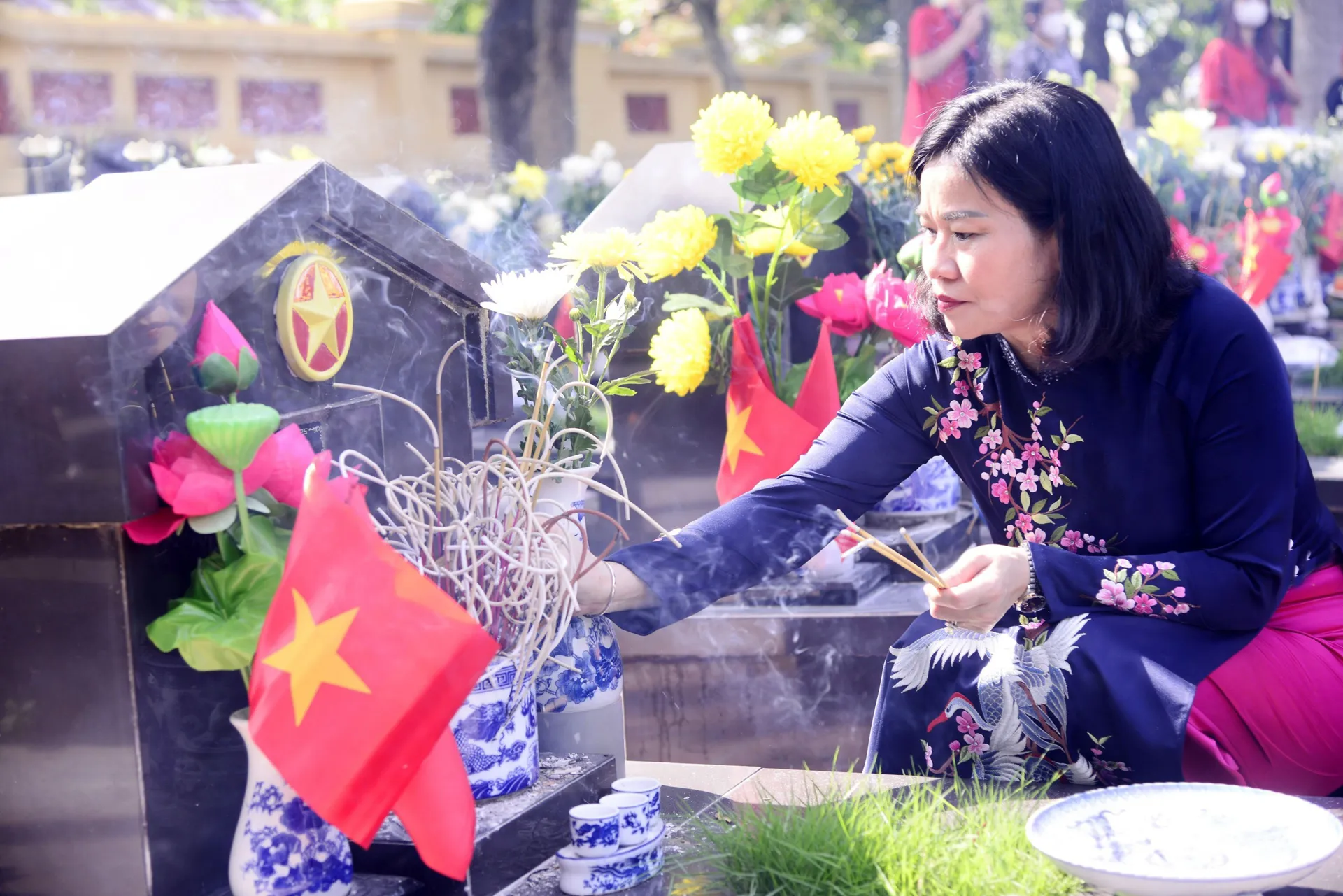 Phó Bí thư Thường trực Thành ủy Nguyễn Thị Tuyến thắp hương cho các Anh hùng liệt sĩ tại Nghĩa trang liệt sĩ Ngọc Hồi.