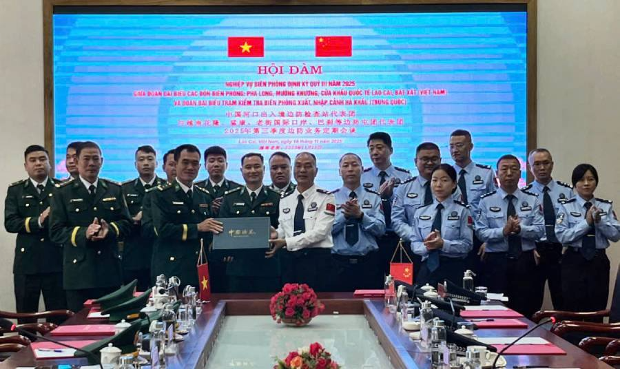 Ngày 18/11, tại tỉnh Lào Cai, Đoàn đại biểu Đồn Biên phòng Pha Long, Mường Khương, Bát Xát và Cửa khẩu quốc tế Lào Cai (Bộ đội Biên phòng tỉnh Lào Cai, Việt Nam) đã tổ chức hội đàm nghiệp vụ công tác Biên phòng quý III/2025 với Đoàn đại biểu Trạm kiểm tra Biên phòng xuất nhập cảnh Hà Khẩu, thuộc Tổng Trạm kiểm tra Biên phòng xuất nhập cảnh tỉnh Vân Nam (Trung Quốc).