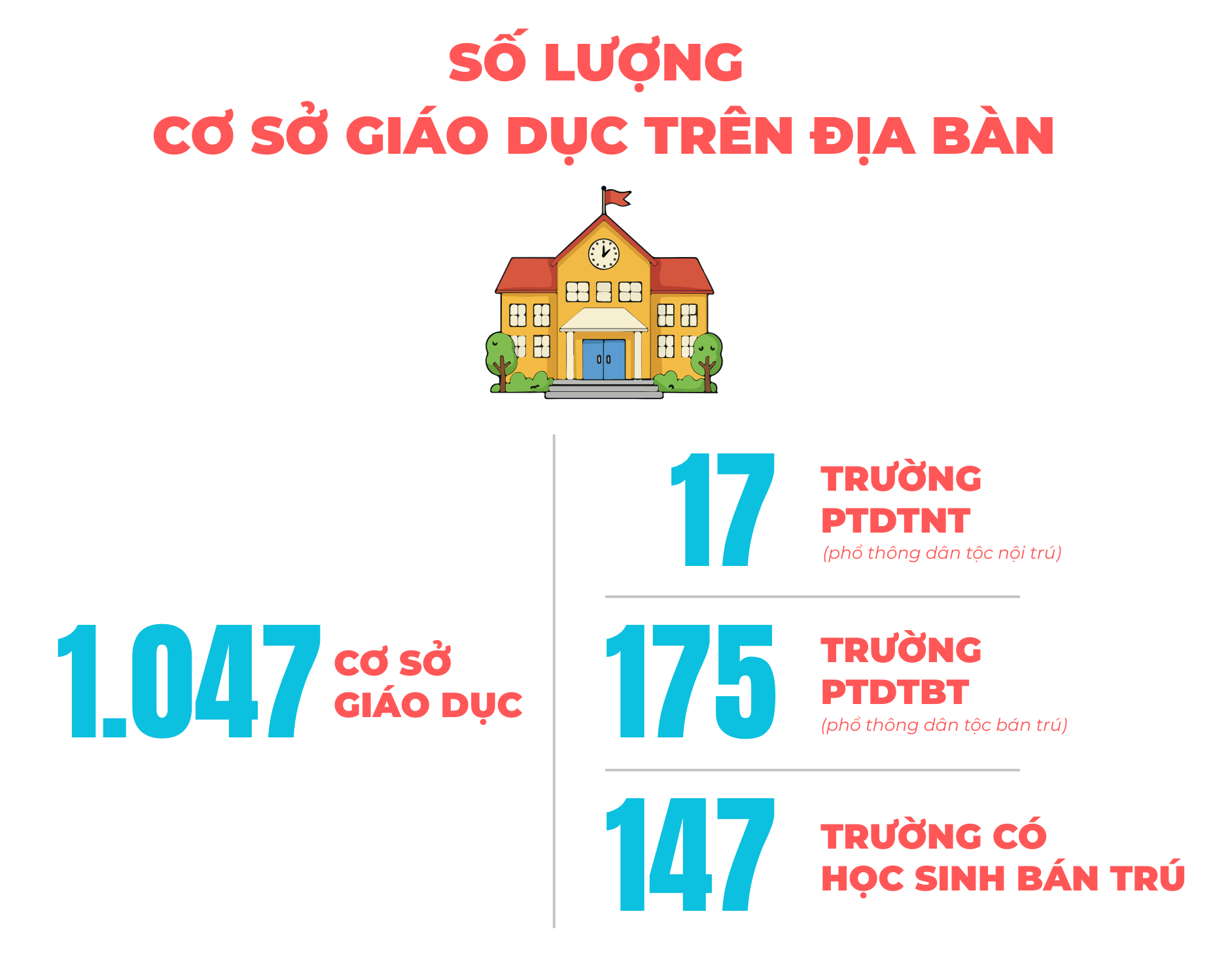 Toàn tỉnh hiện có 1.047 cơ sở giáo dục từ bậc mầm non đến phổ thông, trong đó có 17 trường phổ thông dân tộc nội trú (PTDTNT), 175 trường phổ thông dân tộc bán trú (PTDTBT) và 147 trường có học sinh bán trú. Tổng số học sinh toàn tỉnh đạt hơn 470.000 em, trên 70% là học sinh DTTS - con số cho thấy quy mô lớn và tính chất đặc thù của hệ thống giáo dục Lào Cai.