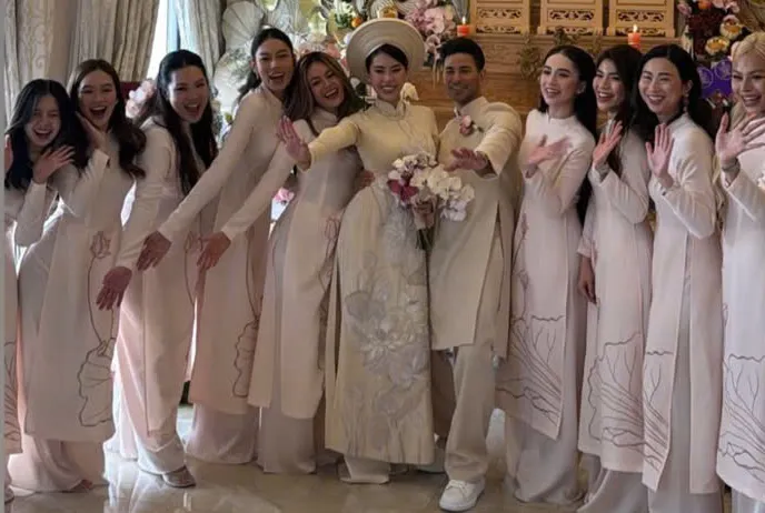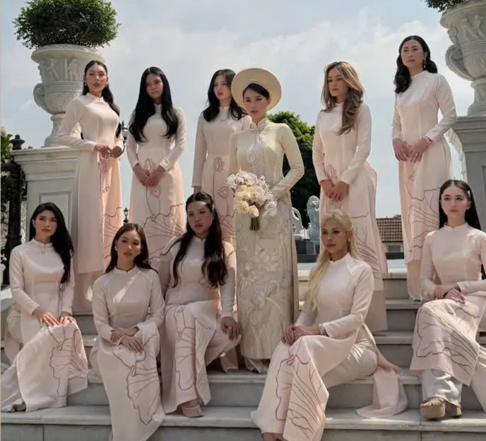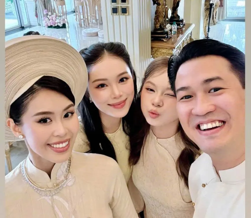 Buổi lễ còn quy tụ dàn bạn bè thân thiết của cô dâu, trong đó có Á hậu Thảo Nhi Lê và nhiều "rich kid" nổi tiếng. Các khách mời nữ diện áo dài hồng phấn, tạo nên không gian rực rỡ khi chụp ảnh cùng cặp đôi.
