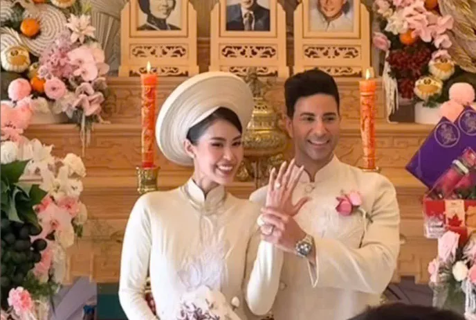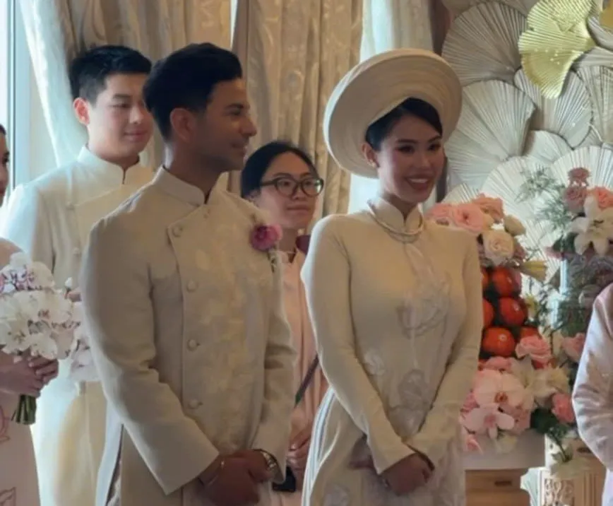 Cô dâu Tiên Nguyễn lựa chọn áo dài truyền thống tông kem, kết hợp mấn tròn và phong cách trang điểm nhẹ nhàng. Điểm nhấn nổi bật nằm ở bộ trang sức kim cương đắt giá đeo trên cổ và tay, làm toát lên vẻ sang trọng “chuẩn ái nữ nhà tỷ phú”. Sánh vai cùng cô dâu, chú rể Justin Cohen - người Dubai - diện áo dài đồng điệu, ghi điểm với vẻ lịch thiệp và phong thái tự tin.