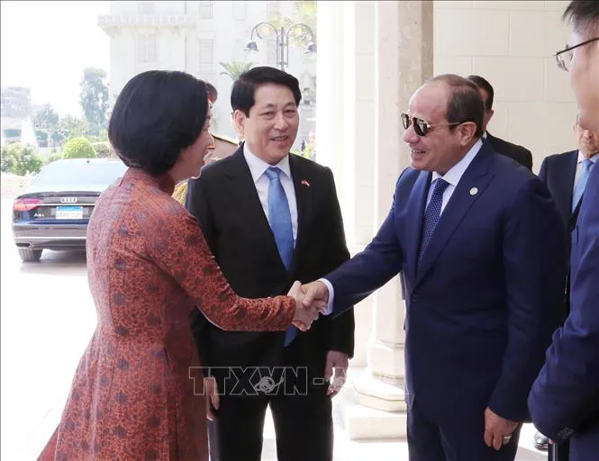Tổng thống Abdel Fattah El-Sisi đón Chủ tịch nước Lương Cường. Ảnh: TTXVN