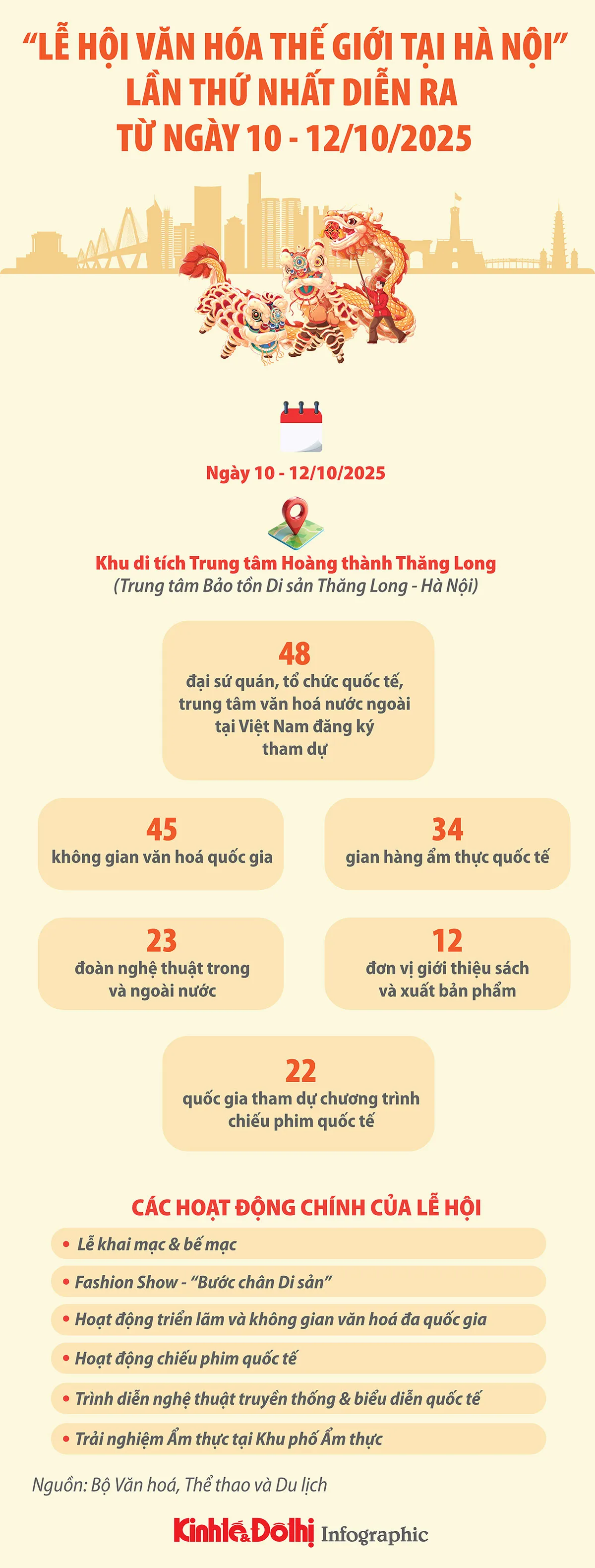 Kinhtedothi - Lễ hội Văn hóa Thế giới tại Hà Nội lần thứ nhất sẽ diễn ra từ ngày 10 - 12/10/2025 tại Khu di tích Trung tâm Hoàng thành Thăng Long, Hà Nội.