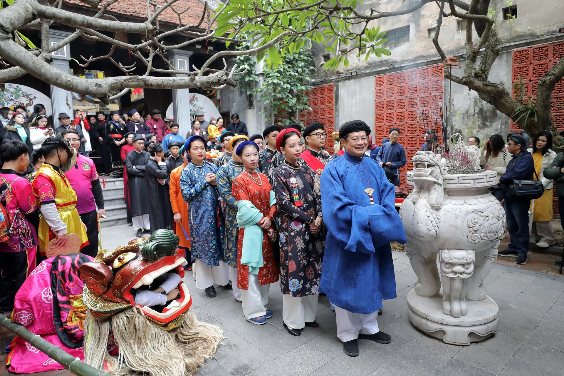Cùng tham gia đoàn rước là các nam, nữ thanh niên của Hà Nội và các địa phương trong trang phục truyền thống, đảm trách nghi thức dâng lễ, đồng hành cùng đoàn lễ bày tỏ lòng thành kính đối với tiền nhân.