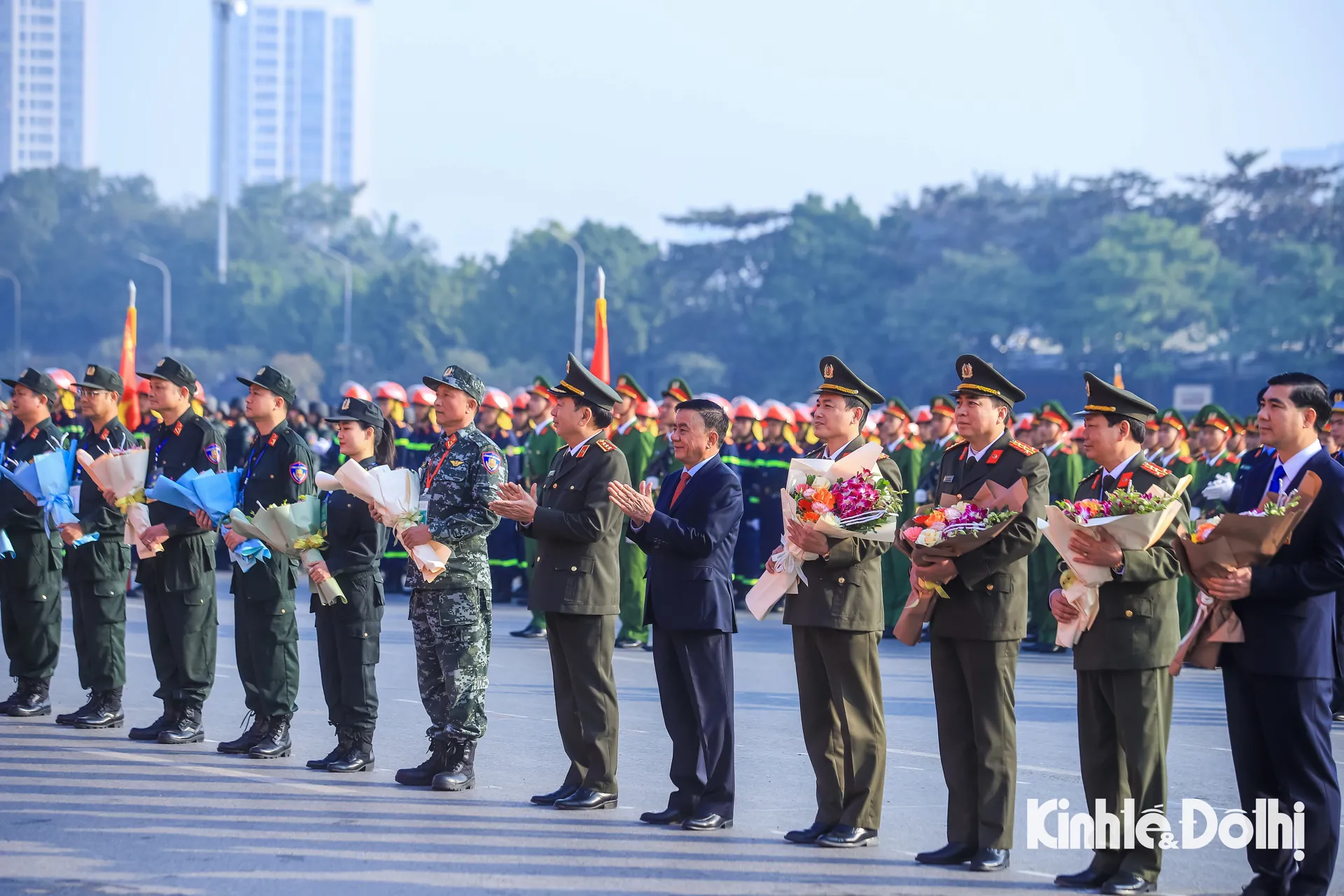 Ủy viên Bộ Chính trị, Thường trực Ban Bí thư Trần Cẩm Tú; Thượng tướng Trần Quốc Tỏ, Uỷ viên Trung ương Đảng, Thứ trưởng Bộ Công an tặng hoa đại diện các khối tham gia Lễ xuất quân.