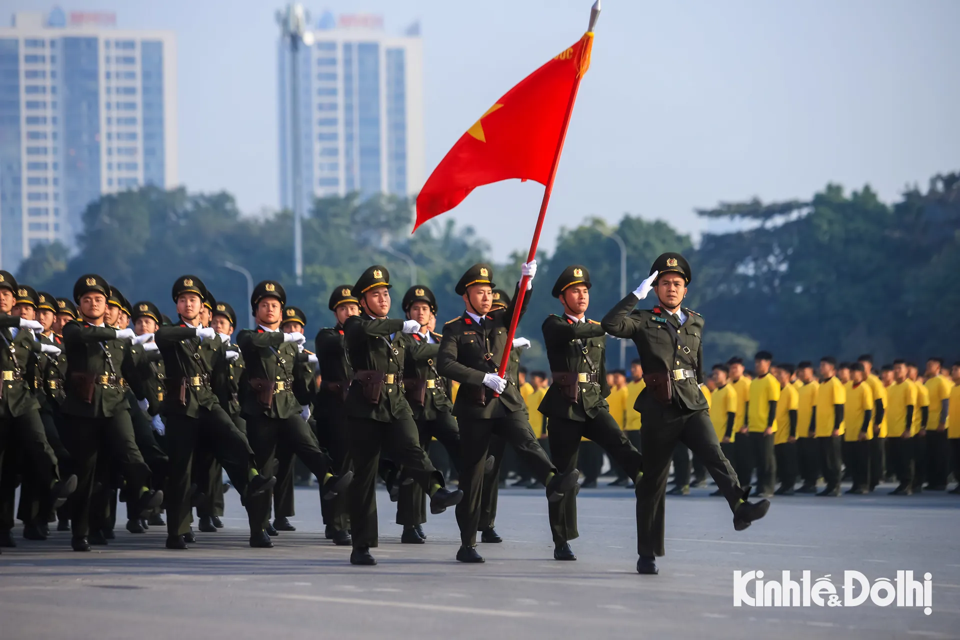 Tổ Công an kỳ, mang theo lá cờ truyền thống vẻ vang “Vì an ninh Tổ quốc” của lực lượng Công an nhân dân anh hùng dẫn đầu đội hình duyệt đội ngũ.