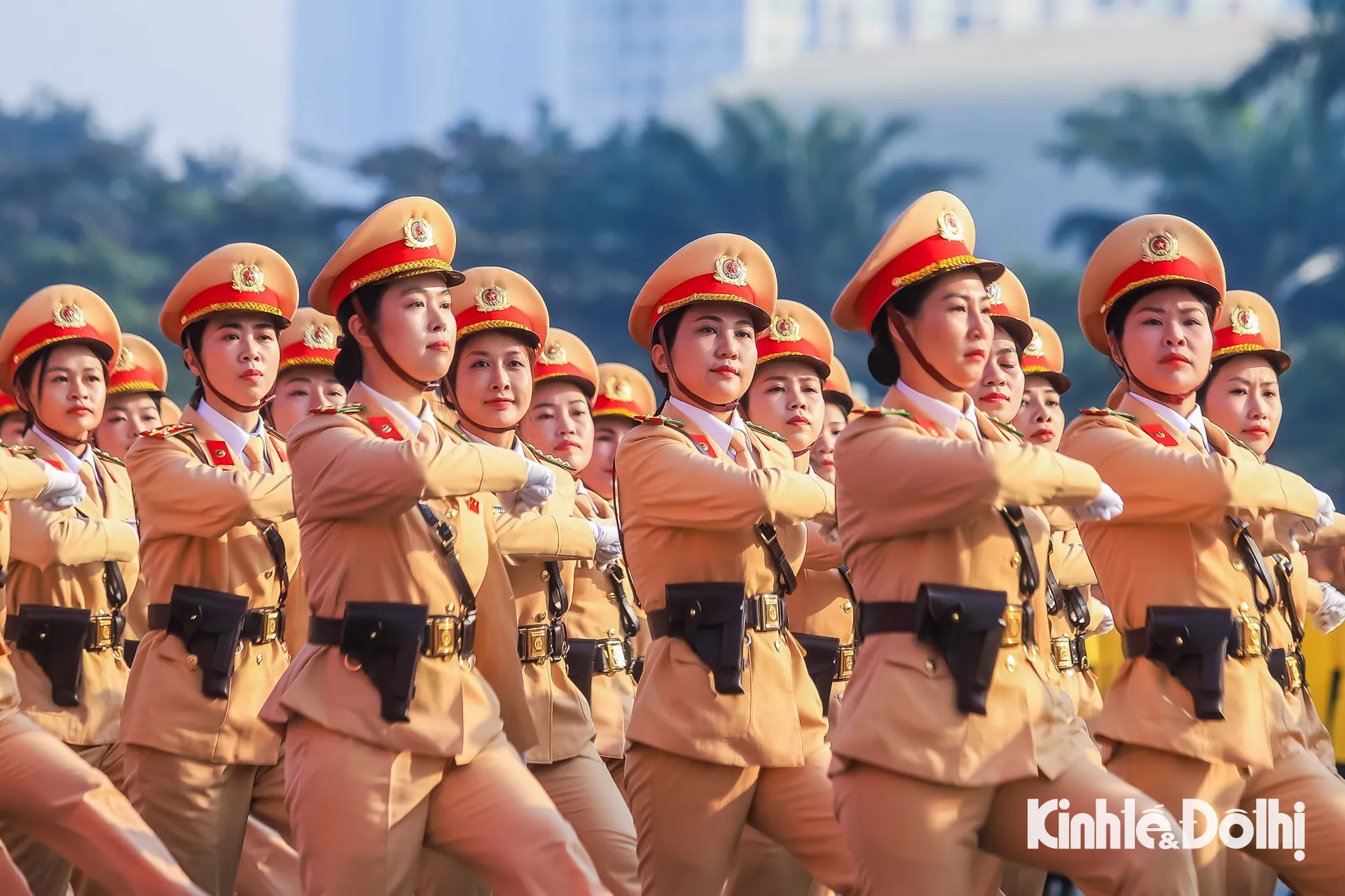 Khối nữ Cảnh sát giao thông, những đóa hoa rực rỡ của Công an Thủ đô tham gia duyệt đội ngũ.