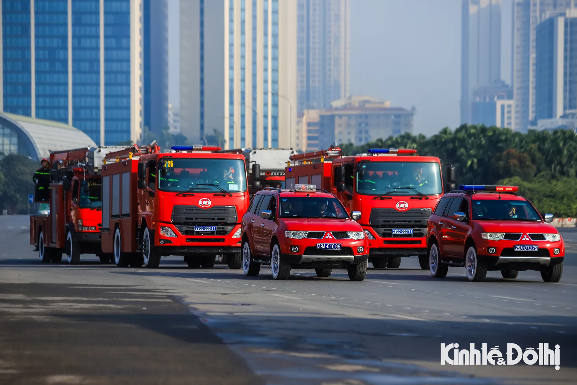 Xe thang của lực lượng phòng cháy chữa cháy xuất hiện trong lễ xuất quân và diễn tập các phương án bảo vệ tuyệt đối an toàn Đại hội đại biểu toàn quốc lần thứ XIV của Đảng, trên nóc lắp tháp thang thủy lực kèm giỏ cứu hộ và hệ thống phun nước từ trên cao. Thùng xe tích hợp nhiều khoang chứa vòi rồng, bình bọt và dụng cụ chuyên dụng, giữ vai trò quan trọng trong chữa cháy đô thị, nhất là tại các tòa nhà cao tầng.