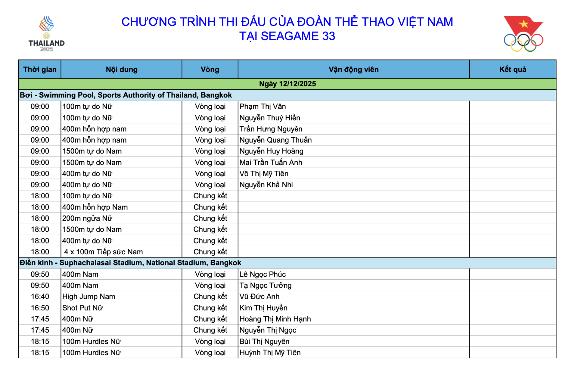 Trong ngày thi đấu thứ 3 tại SEA Games 33, Đoàn Thể thao Việt Nam tiếp tục đặt niềm tin vào môn bơi khi những kình ngư hàng đầu sẽ tranh tài. Cụ thể, kình ngư Nguyễn Huy Hoàng sau khi giành HCV đồng đội trong ngày 11/12 sẽ cùng Mai Trần Tuấn Anh tranh tài ở nội dung 1.500m tự do nam. Trong khi đó, Trần Nguyên Hưng và Nguyễn Quang Thuấn tiếp tục cùng cạnh tranh ở nội dung 400m hỗn hợp nam. Ở nội dung 400m hỗn hợp nữ có sự xuất hiện của Võ Thị Mỹ Tiên và Nguyễn Khả Thi.