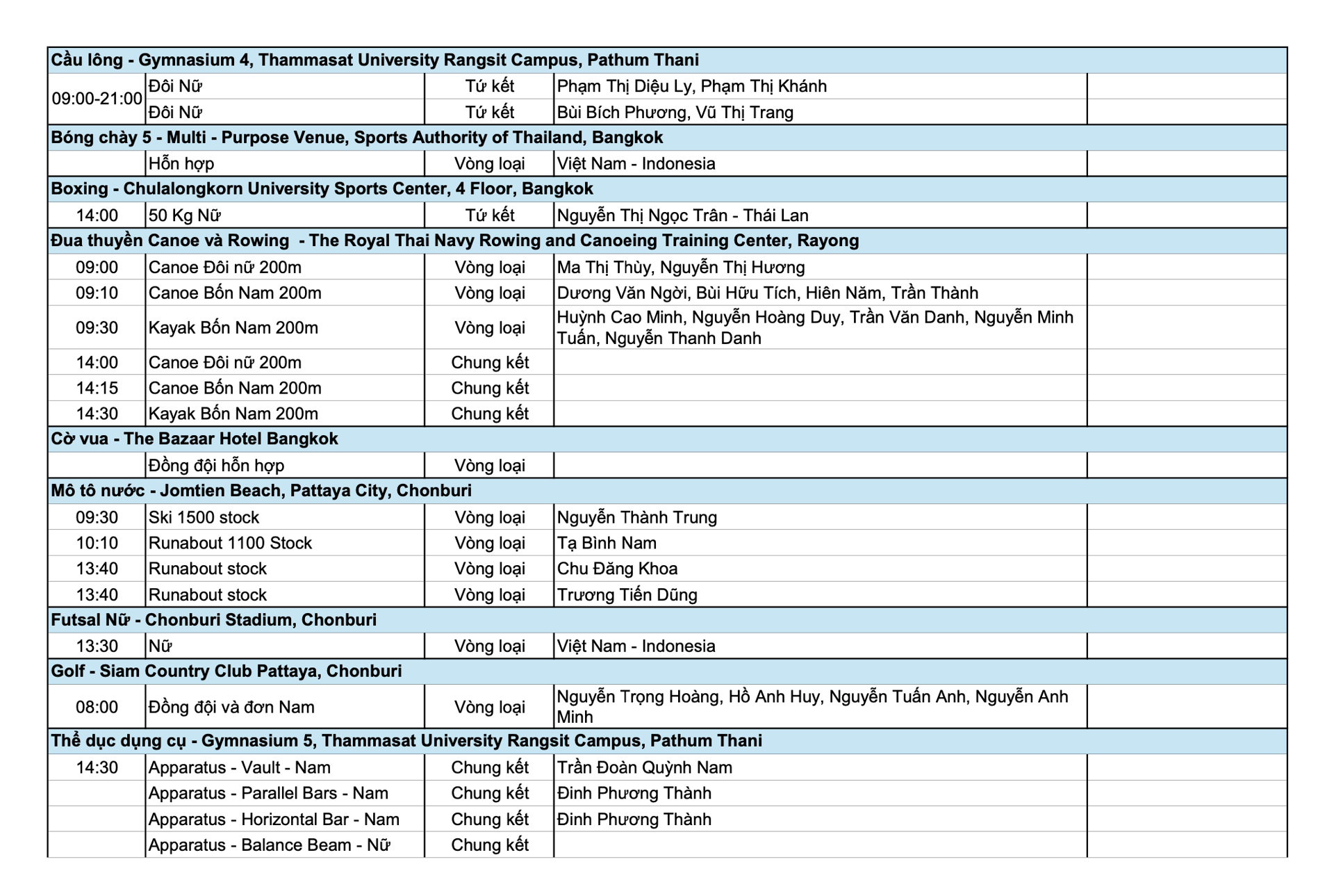 Niềm hy vọng khác của Đoàn Thể thao Việt Nam là điền kinh sau khi giành 2 tấm HCV ở ngày ra quân. Cặp vận động viên Bùi Thị Nguyên và Huỳnh Thị Mỹ Tiên sẽ tranh tài ở nội dung 100m rào nữ. Ở nội dung 400m nữ có Hoàng Thị Minh Hạnh và Nguyễn Thị Ngọc. Trong khi đó, Đinh Phương Thành của thể dục dụng cụ cũng tranh tài sau khi đồng đội đã giành 2 HCV trong ngày 11/12.