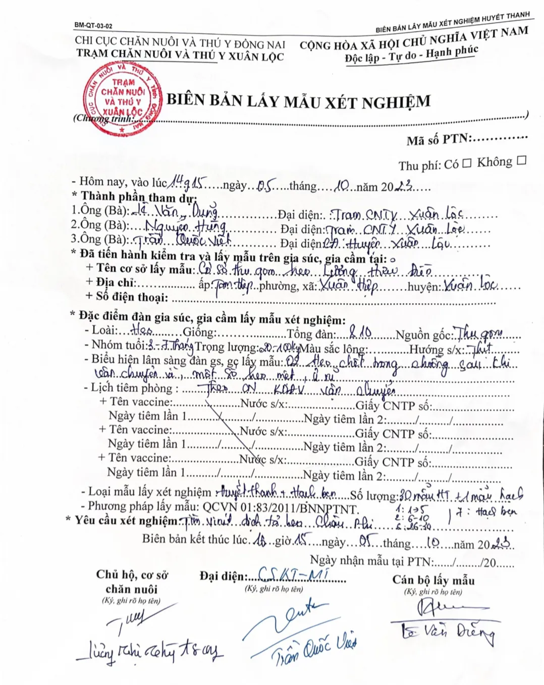 Biên bản lấy mẫu xét nghiệm do Trạm chăn nuôi và thú y Xuân Lộc thực hiện lúc 14 giờ ngày 5/10/2023. Cũng tại cơ sở thu gom heo Lương Hữu Điền, thể hiện đàn heo lấy mẫu xét nghiệm trên tổng đàn 810 con. Nguồn gốc heo được thu gom từ các địa phương ngoài tỉnh Đồng Nai. Biểu hiện lâm sàng đàn heo lấy mẫu: Có 2 con heo chết trong chuồng sau khi vận chuyển về, một số heo mệt mỏi, ủ rũ.
