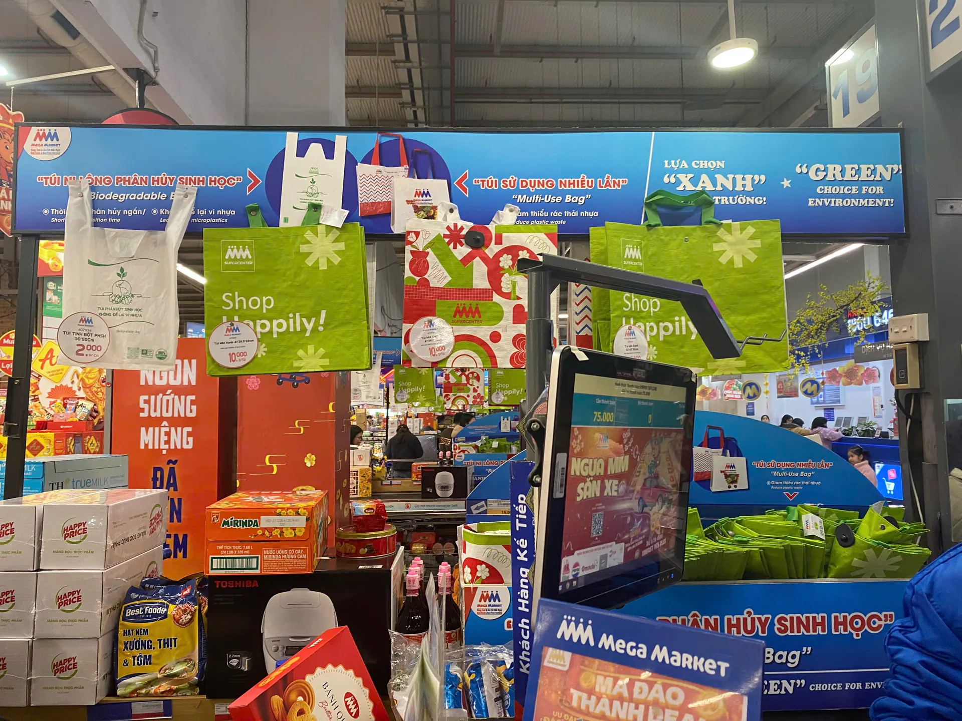 Các loại túi thân thiện với môi trường được bày bán và khuyến khích sử dụng tại khu vực thanh toán. Ảnh: Hương Giang