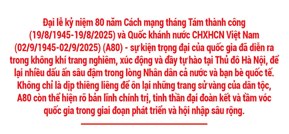 Hiếm có sự kiện nào mà niềm tự hào dân tộc lại trỗi dậy sâu sắc như A80. Bởi đây không chỉ là lễ kỷ niệm một biến cố lịch sử, mà là một bản tuyên ngôn sống động về sức mạnh, bản lĩnh và giá trị tinh thần đã làm nên hồn cốt của dân tộc Việt. Qua tám thập kỷ kháng chiến, xây dựng và phát triển, Việt Nam không chỉ gìn giữ được độc lập, mà còn dựng xây nên một quốc gia hiện đại, hội nhập, hướng tới tương lai bằng chính nội lực và niềm tin vào con người.