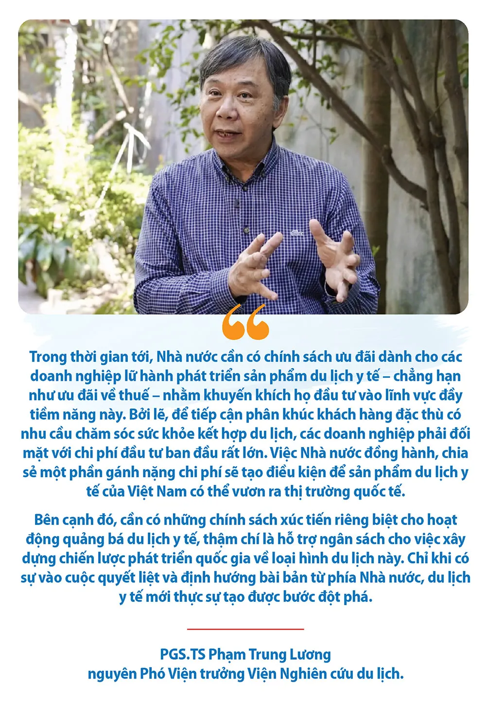 Phía doanh nghiệp lữ hành mong muốn, Nhà nước sớm ban hành khung pháp lý rõ ràng, chính thức công nhận du lịch y tế là một lĩnh vực kinh tế - dịch vụ đặc thù để dễ dàng quản lý và phát triển. Bộ VHTT&DL cùng Bộ Y tế phối hợp xây dựng bộ tiêu chuẩn chất lượng dịch vụ y tế kết hợp du lịch theo chuẩn quốc tế. Song song đó, triển khai chiến dịch quảng bá tại các thị trường trọng điểm như Nhật Bản, Hàn Quốc, Mỹ, châu Âu, nơi có nhu cầu du lịch y tế lớn. Một yếu tố không kém phần quan trọng là phát triển nguồn nhân lực. Theo đó, chúng ta cần những hướng dẫn viên am hiểu về y tế, cùng các bác sĩ có kỹ năng giao tiếp quốc tế, được hỗ trợ bởi đội ngũ quản lý du lịch chuyên nghiệp.